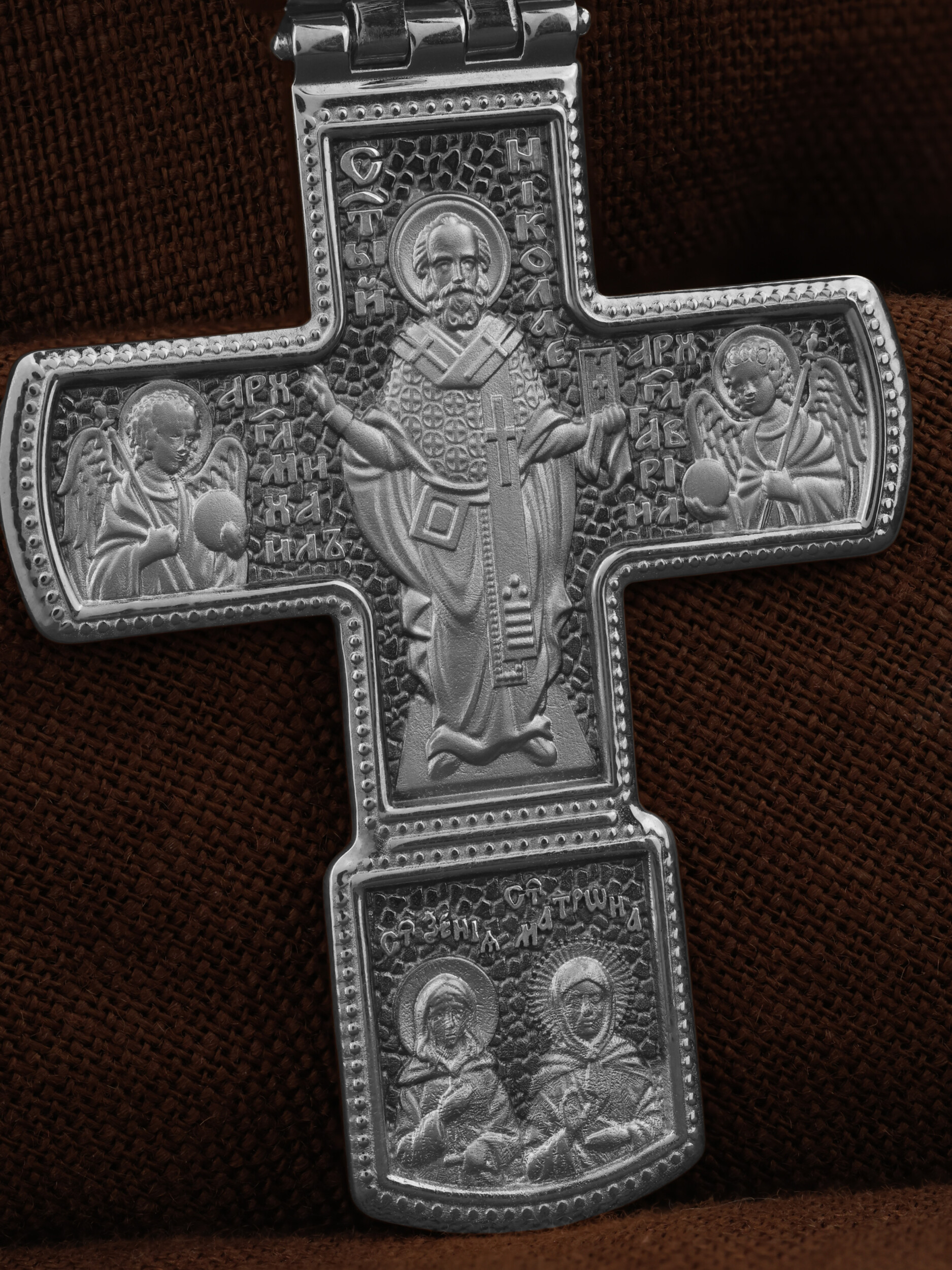 В центре на обороте — самый почитаемый в Православной Церкви святой, Николай Чудотворец, которого еще называют Николай Угодник за то, что он угодил своей жизнью Богу. Ему молятся, отправляясь в путешествие, особенно по морю, просят исцеления в различных недугах, помощи в торговых делах, учебе и поисках достойного супруга. С двух сторон от Николая Чудотворца помещены образы архангелов Михаила и Гавриила. Вверху — Владимирская икона Божией Матери — самая великая русская святыня, многие века бывшая олицетворением нашей земли. Перед ней венчались на царство государи, избирались патриархи. Пречистой Богородице Владимирской клялись в верности Отечеству солдаты и за нее умирали на поле брани. Именно на ее защиту более всего уповала Россия в самые страшные периоды своей истории. В нижнем клейме — иконы двух святых помощниц от всех недугов, блаженных Ксении Петербургской и Матроны Московской.