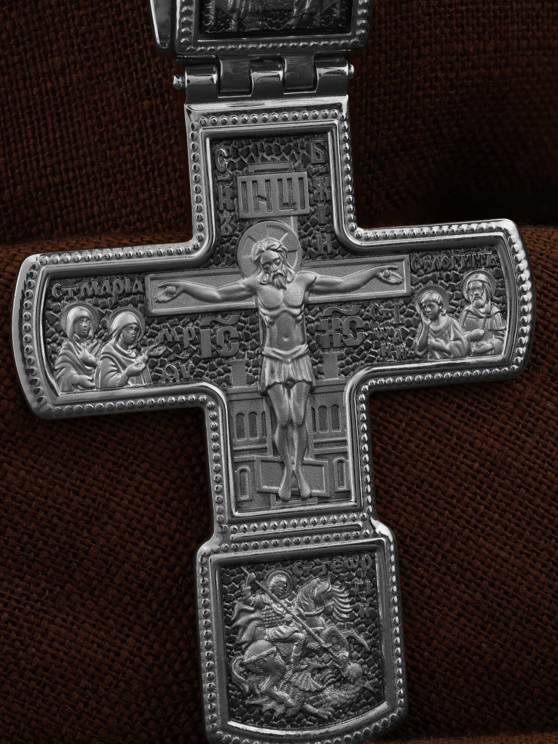 На кресте изображено Распятие Господа нашего Иисуса Христа. Ему предстоят Святая Мария Магдалина, Пресвятая Богородица, апостол Иоанн и Святой Иосиф, свидетели крестных страданий Господа. Вверху — икона Святой Троицы, на которой запечатлено явление Триединого Бога праотцу Аврааму в виде трех ангелов. В нижнем клейме изображено Чудо Святого Георгия о змие. Великомученик Георгий почитается как покровитель воинов, защитник от злых сил, помощник в духовной борьбе.