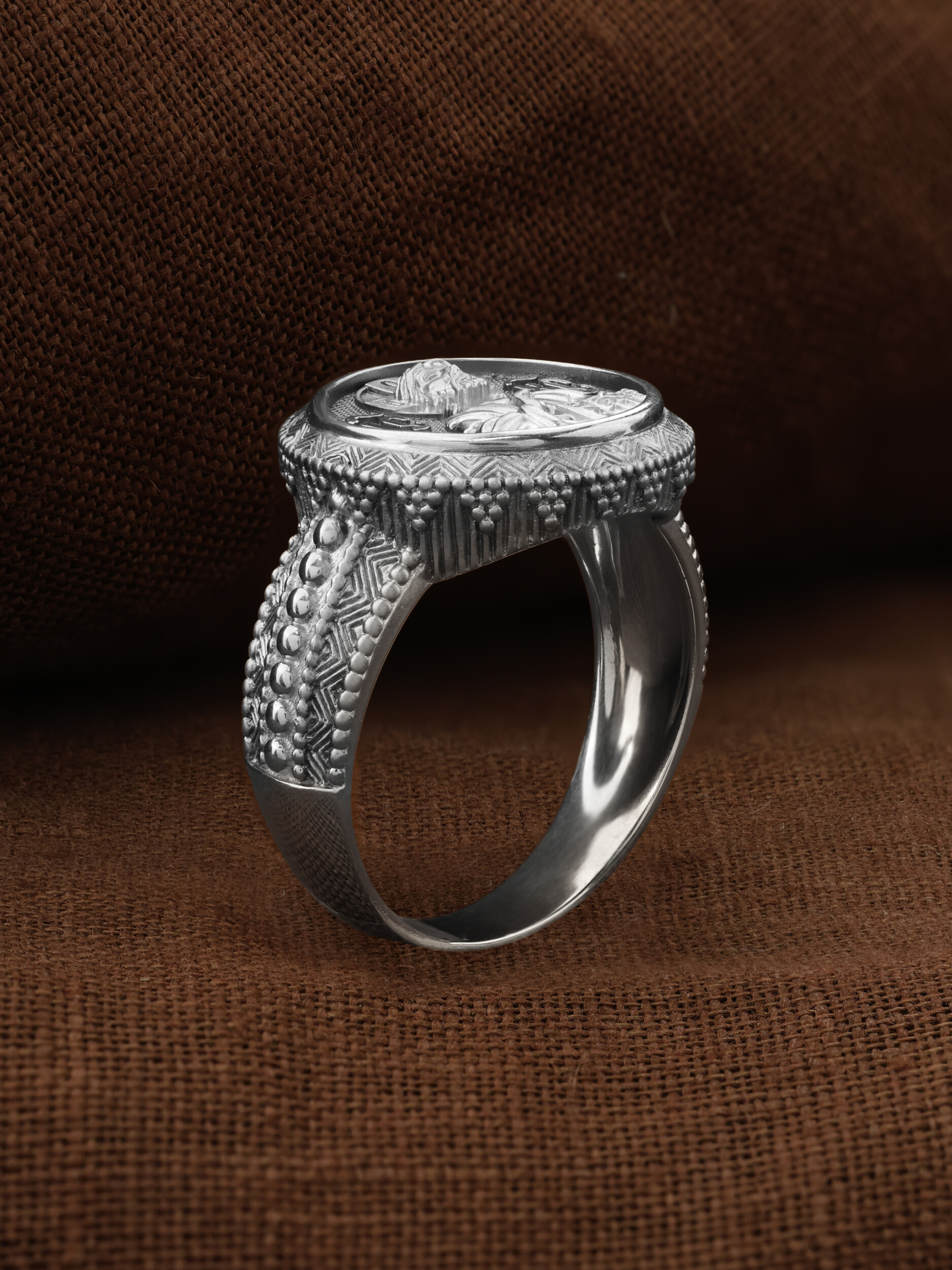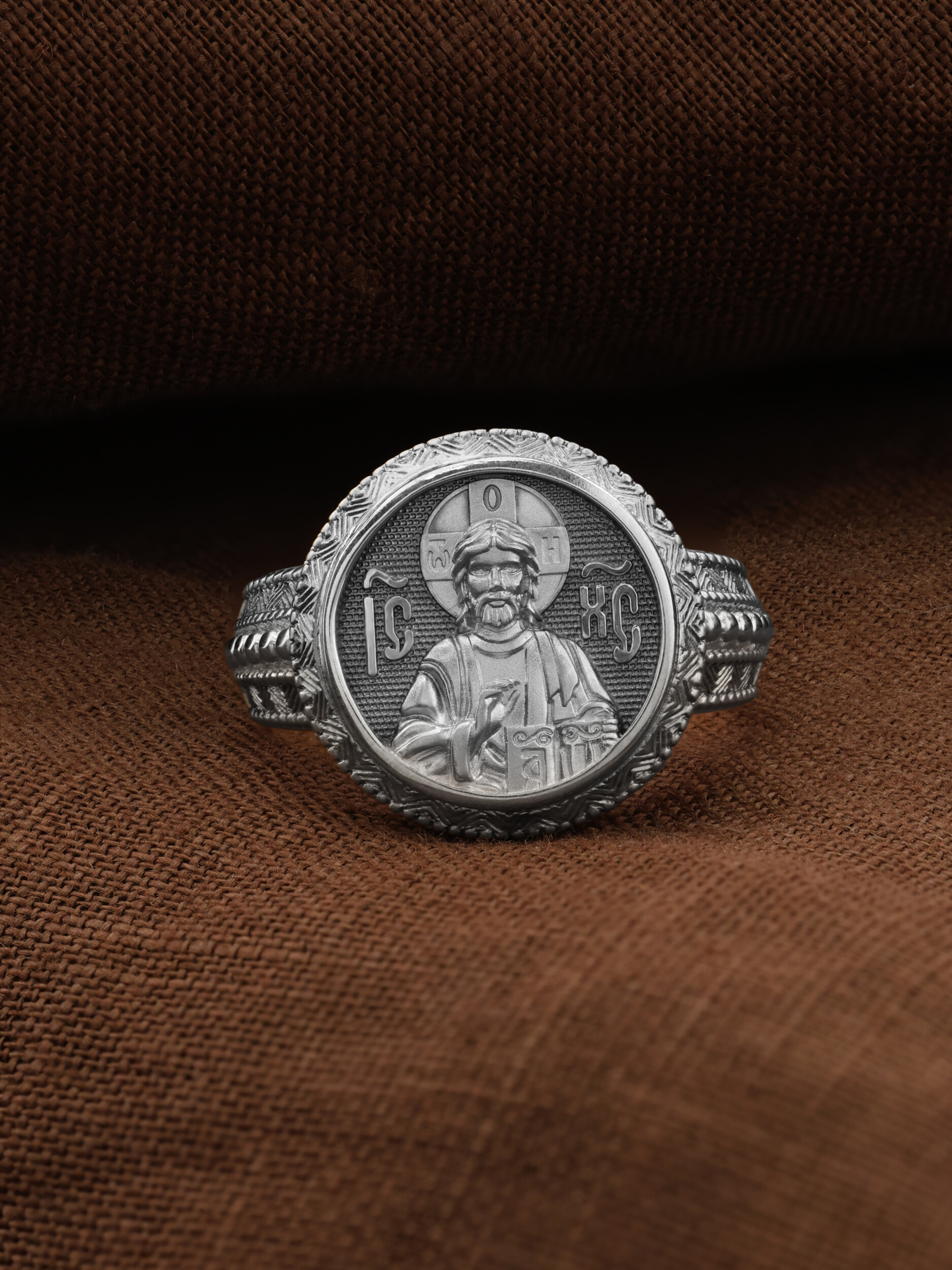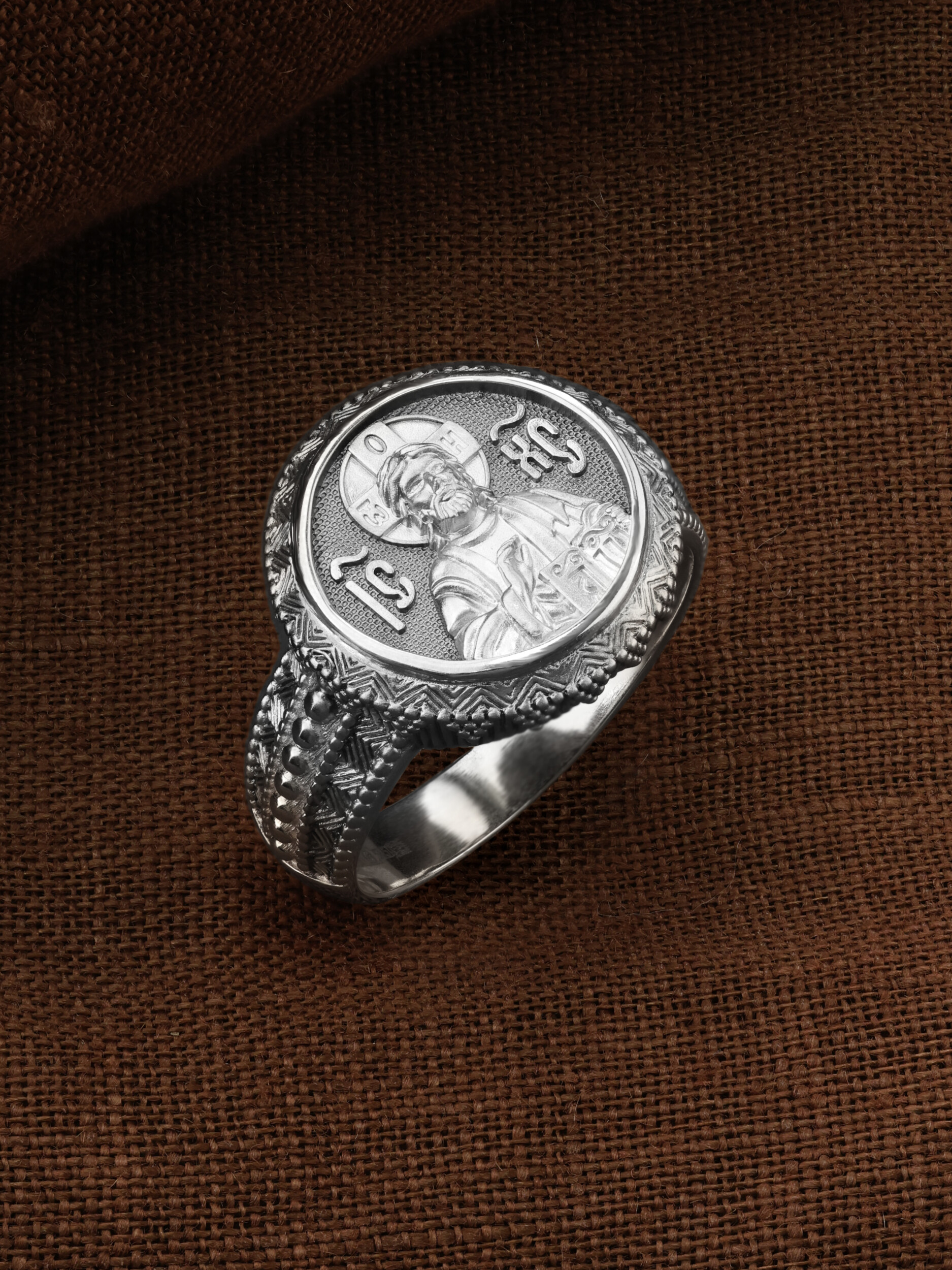 Кольцо «Господь Вседержитель» выполнено в древних христианских традициях. Господь Вседержитель или Пантократор (от греч. всевластный, всесильный). Он представлен как Царь Небесный и будущий Судия мира. Именование Иисуса «Вседержителем» указывает, с одной стороны, на Его Божественную природу: «Аз есмь Альфа и Омега, начало и конец, говорит Господь, Который есть и был и грядет, Вседержитель» (Откр. 1: 8). С другой стороны, такое именование связано и с человеческой природой Христа, искупившего крестной жертвой людские грехи и обновившего тем самым человеческую природу. Господь Иисусь Христос изображен фронтально огрудно. Главу Спасителя осеняет нимб, на нем угадывается крест. Крест символизирует голгофскую жертву Спасителя. По греческой традиции, на нимбе написаны буквы Омега, Омикрон, Ню — вместе они обозначают слово Сущий, одно из имен и характеристику Бога, согласно Священному Писанию. Правой рукой Он благословляет, а левой держит Евангелие — благую весть, принесенную Христом всему миру. Также означает она тот новый мир, который будет сотворен Богом после второго пришествия Христа. Символизирует и Книгу Жизни, где записаны имена всех, возлюбивших Бога. Всемогущий Бог предстает здесь не как обличающий судья, а как милостивый отец, ждущий возвращения блудных детей.