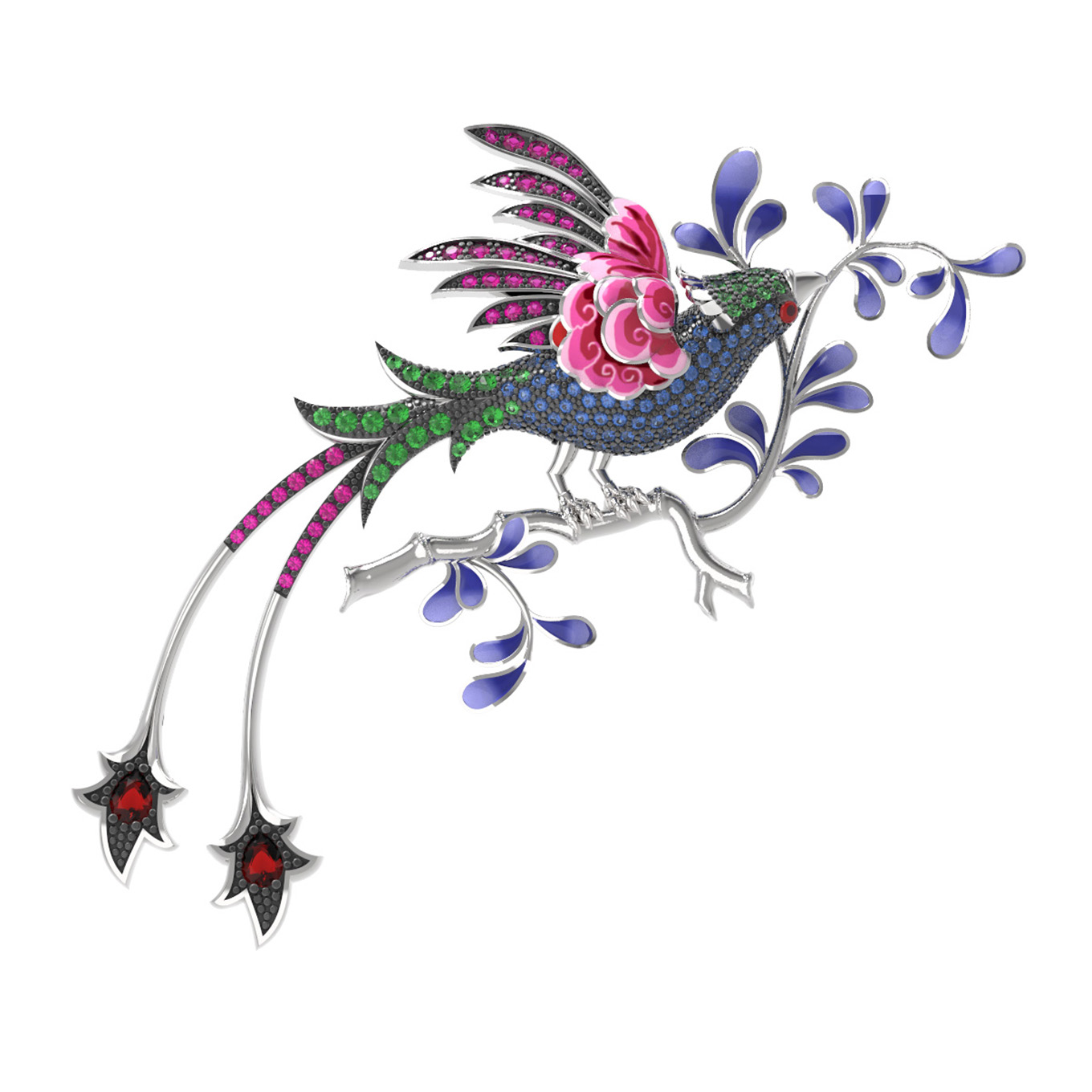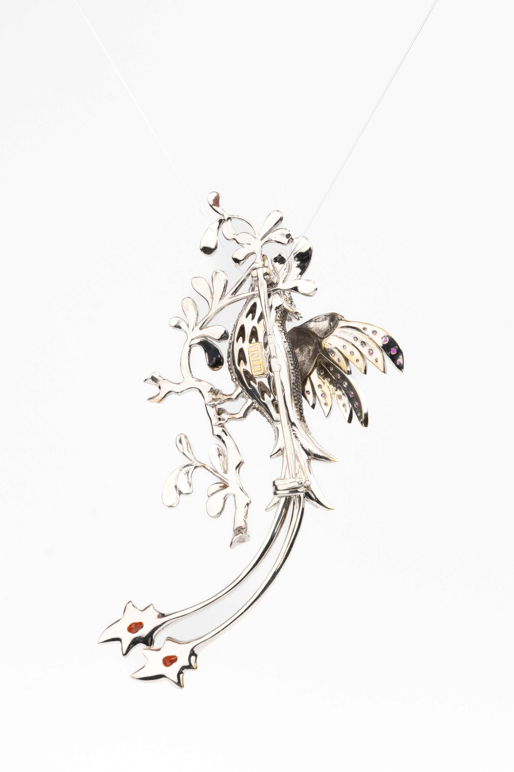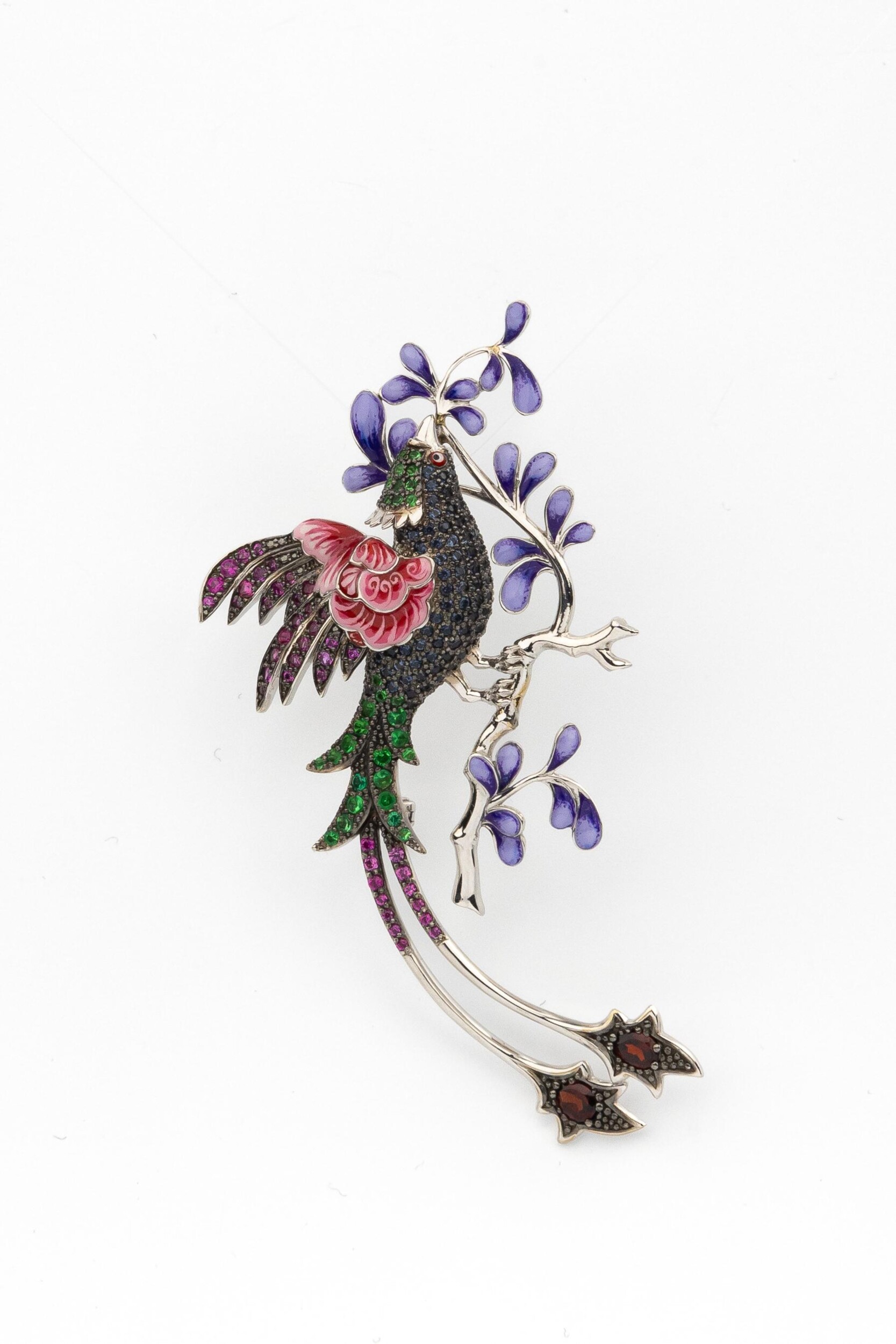Брошь из белого золота c эмаль, фианитом и гранатом