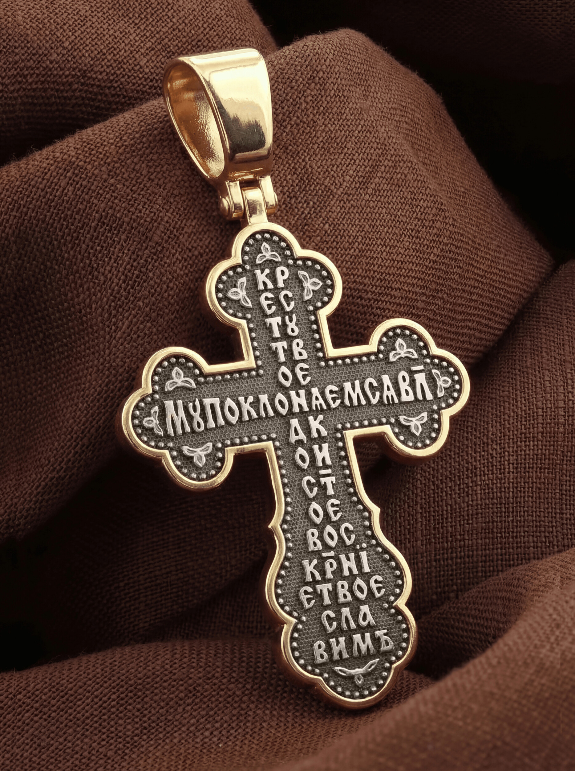 На лицевой стороне креста изображено Распятие, потому что это орудие казни Иисус Христос сделал орудием победы над грехом и смертью. Своими страданиями Он искупил грехи человечества, умерев и сошествовав во ад, победил сатану, освободил души праведников от вечной смерти и открыл им небесные врата рая. Жертва Христа сделала возможным спасение для каждого человека. На православном кресте Христос не умирает, а свободно простирает руки, ладони Иисуса открыты, будто он хочет обнять все человечество, даря им свою любовь и открывая путь к вечной жизни. Над титлом видим слова «ЦРЬ СЛВЫ» — Царь Славы. Верхняя перекладина символизирует собой табличку с надписью «IHЦI» — Иисус Назарянин Царь Иудейский. Возле перекладины пишется сокращенно имя Спасителя «IC XC» — Иисус Христос. Возвышение, на котором стоит Крест, символизирует гору Голгофу, на которой произошло Распятие. У подножия Креста изображают прах Адама, обозначенный черепом.