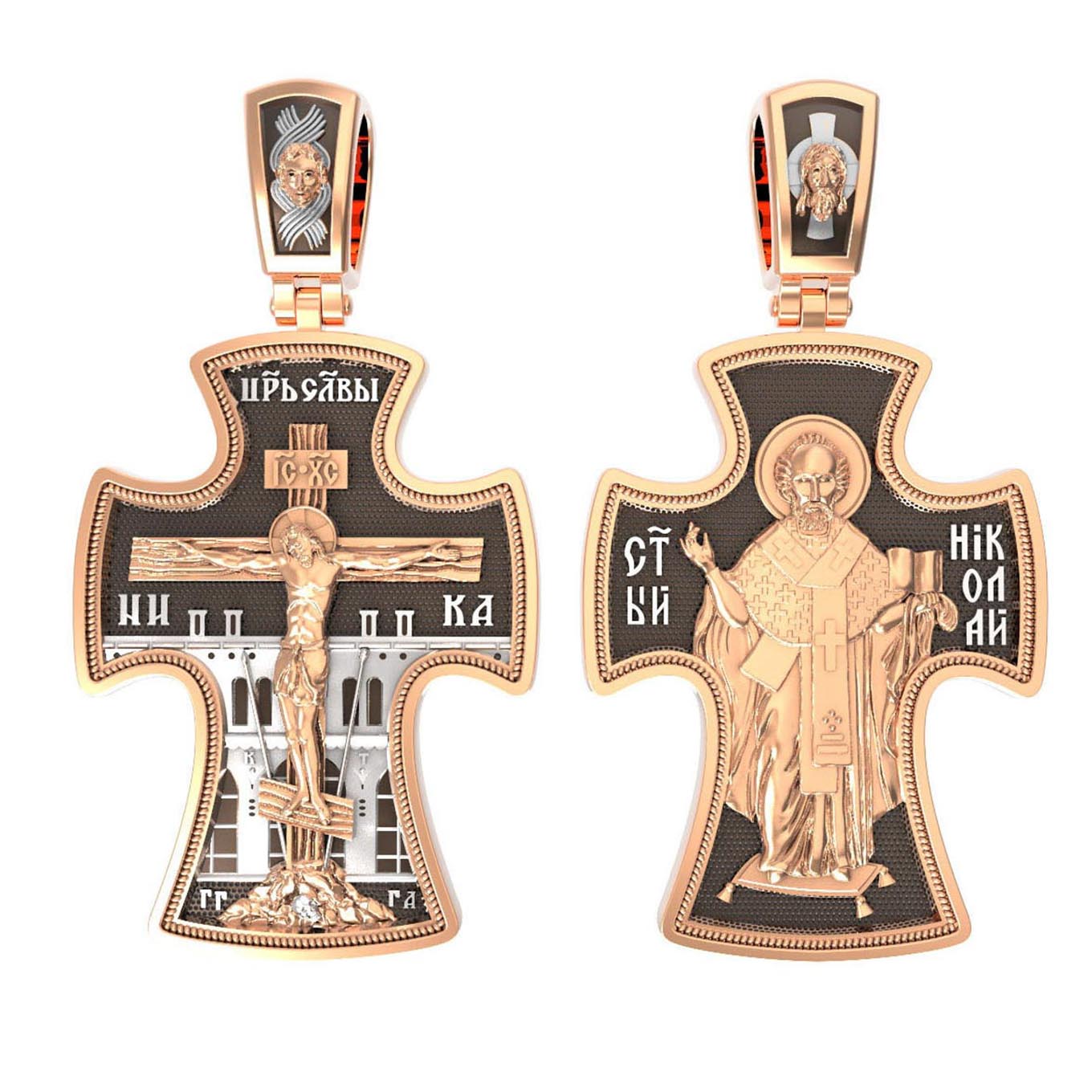 Оборотную сторону креста возглавляет икона святителя Николая Чудотворца, которого еще называют Николай Угодник за то, что он угодил своей жизнью Богу. Николай Чудотворец, помощник в делах, покровитель учащихся, утешитель обиженных. Также Святитель Николай Чудотворец известен своими молитвами за путешественников, когда непрестанный ветер и бушующие волны утихают и корабль заходит в спокойную гавань. На кулонном кольце изображен Спас Нерукотворный — Символ вочеловечившегося Божества и четырехкрылый Херувим.