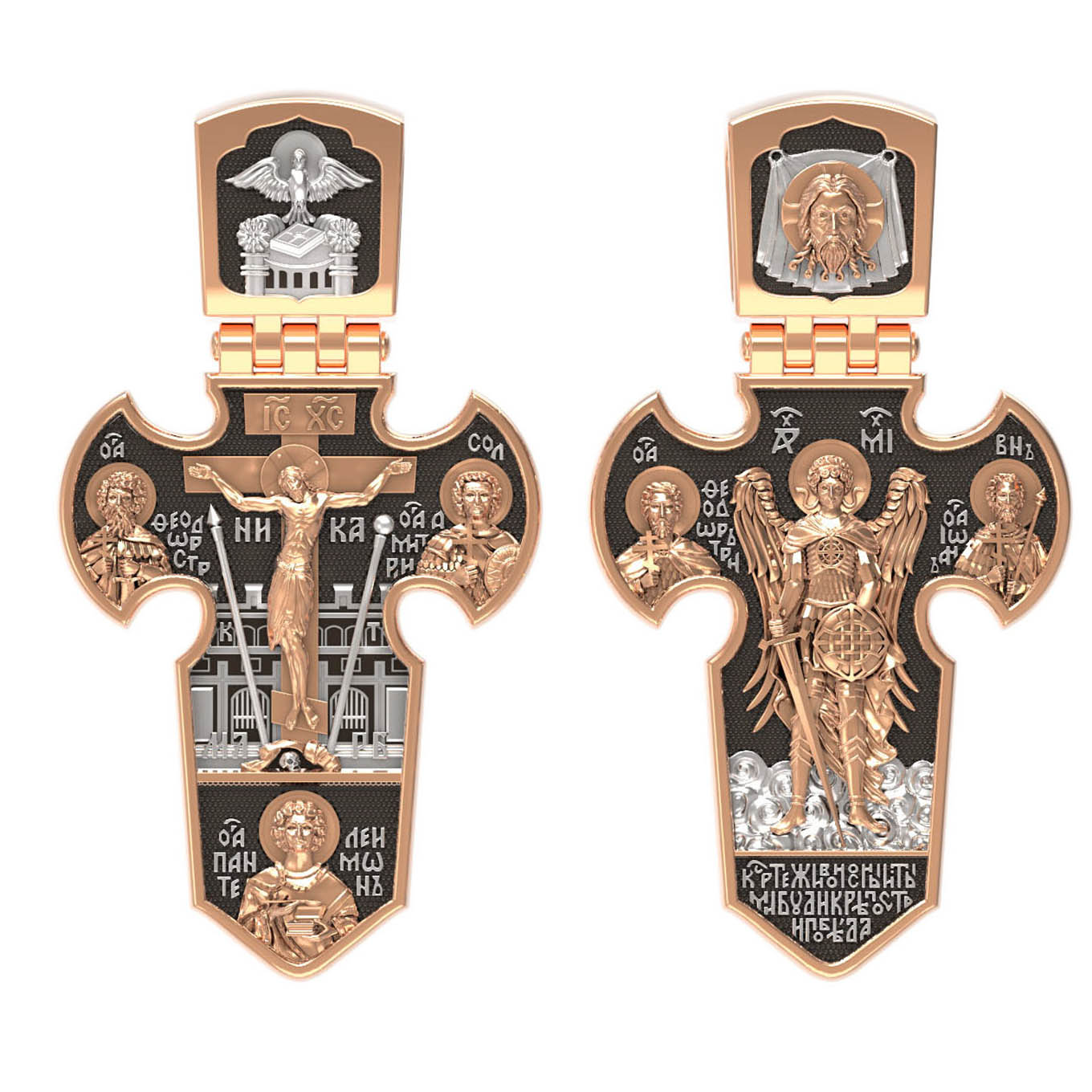 Оборот креста открывается величественной фигурой Архангела Михаила, архистратига Небесного воинства. Его имя означает «Кто яко Бог?», так как он самый могучий и грозный враг зла. С двух сторон от Архистратига Михаила предстоят еще два воина дружины Христовой: великомученик Феодор Тирон и мученик Иоанн Воин. В основании креста молитвенное обращение из Канона, написанного в XIV веке святым монахом Григорием Синаитом: «Кресте Живоносный, ты ми буди крепость и победа». Это молитва воина, восставшего против зла с любовью к ближнему, верой в Бога и надеждой на неизменную помощь Его Небесного Воинства.