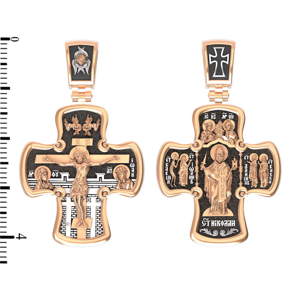 Лицевая сторона креста по канону посвящена Господу Иисусу Христу. Чаще всего на нательных крестах изображается Распятие, которое символизирует победу над грехом и смертью. Своими страданиями Господь искупил грехи человечества: умерев и сошествовав во ад, Он победил дьявола, освободил души праведников от вечной смерти и открыл им Небесные врата рая. Жертва Христа сделала возможным спасение для каждого человека. Поэтому на православных крестах Господь изображается не страдающим, а словно возносящимся и обнимающим весь мир. Он — Спаситель человечества, поправший смертию смерть и призывающий к Себе «все концы земли» (Ис. 45, 22). С двух сторон от Христа изображаются Его Мать, Пресвятая Богородица, и любимый ученик, апостол Иоанн Богослов. Они стояли у Креста неотлучно до самого конца, пока Господь не предал дух Свой Небесному Отцу. Позади — Иерусалимская стена. На иконах она обозначает место казни и символизирует Небесный Иерусалим, путь в который открылся для человечества через Голгофу.