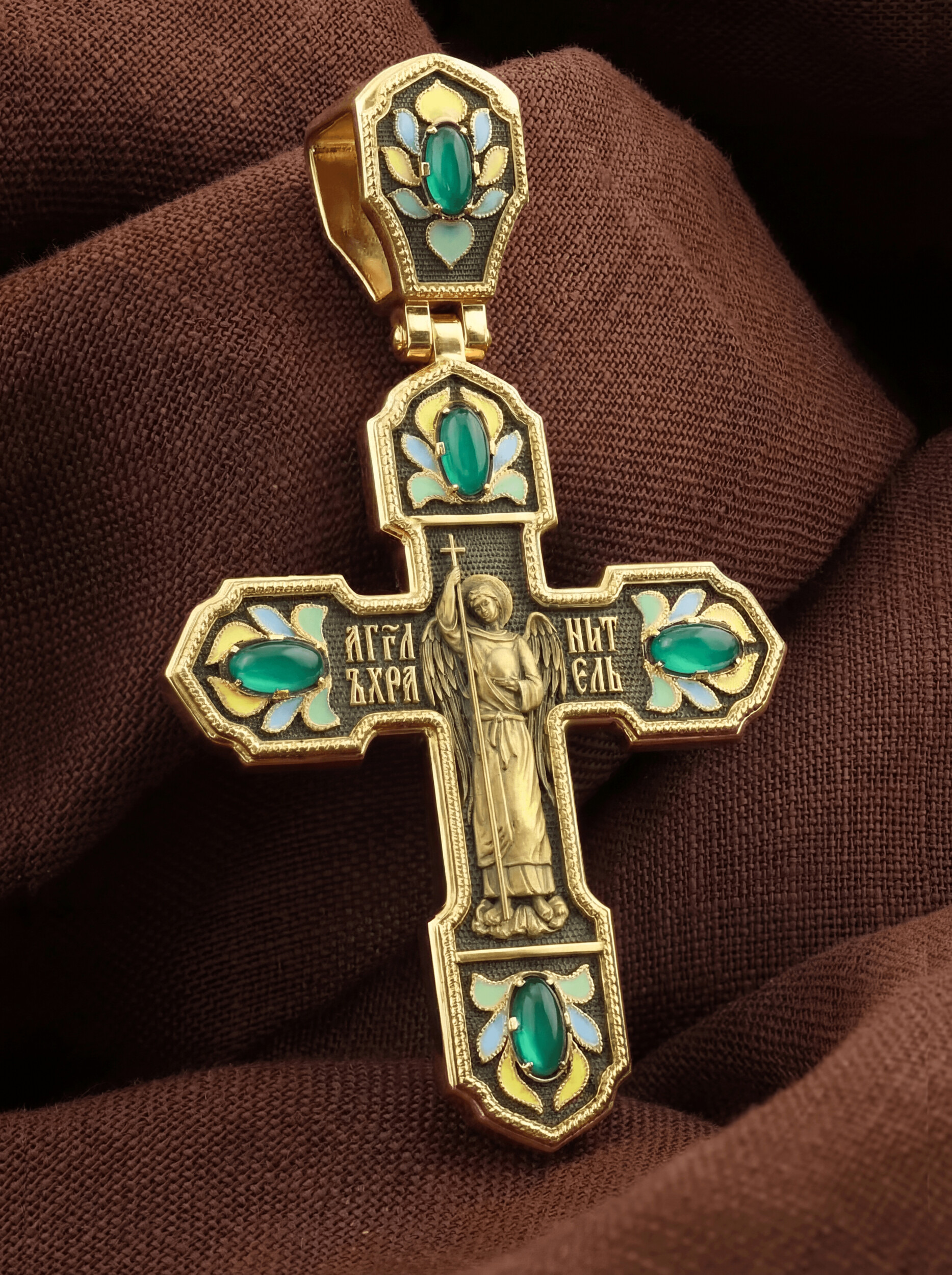Крест из лимонного золота c эмаль и хризопразом
