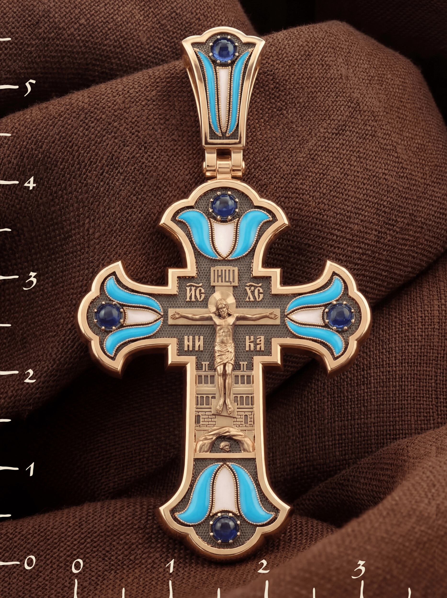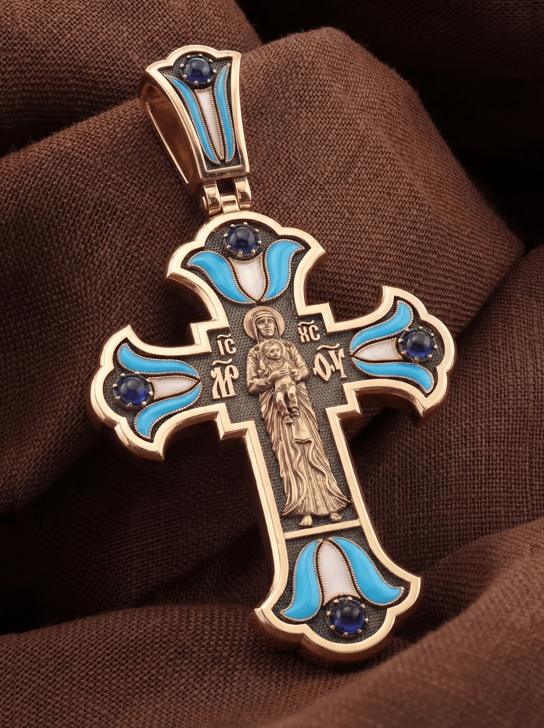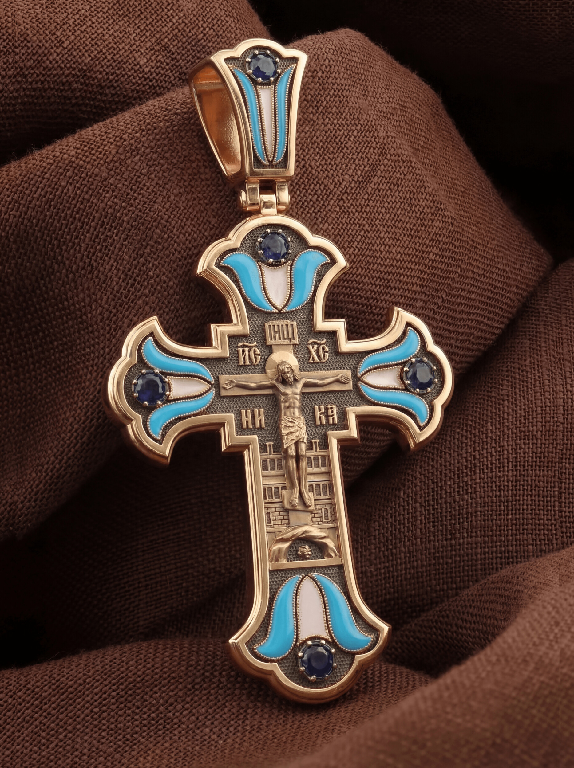 На лицевой стороне креста изображено Распятие Господа и Спасителя нашего Иисуса Христа. Христос, подвергнутый на кресте мучительной казни, своими страданиями искупил нас от древнего греха и даровал нам жизнь вечную. На верхней табличке, выше головы Иисуса, расположена надпись, составленная Понтием Пилатом — «IНЦI». Она означает «Иисус Назорей, Царь Иудейский». Надписи «IС» « ХС» означает Иисус Христос и слово «НИКА», что означает «победитель», помещается на разных сторонах поперечной перекладины креста. За крестом высится Иерусалимская стена, в знак того, что Господь был распят вне стен города. Крест стоит на горе камней, символизирующих Голгофу. Под подножием Креста изображена покоящаяся голова (череп) Адама, грехи которого Христос омыл Своею Кровью.