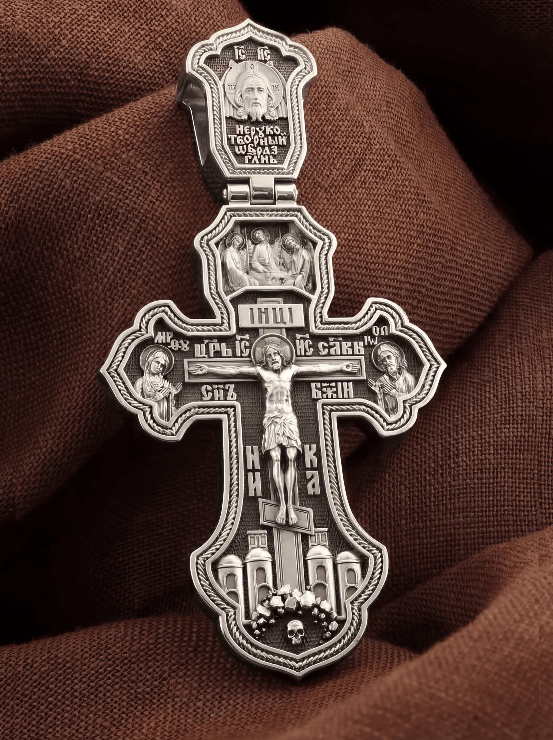 На лицевой стороне креста изображено Распятие Господа и Спасителя нашего Иисуса Христа, отдавшего Себя на смерть, для искупления грехов мира. Крест является символом жертвенной любви Всеблагого Бога к падшим людям, всепобеждающим духовным оружием христиан, основанием и средоточием церковной жизни. Господь сказал: кто хочет идти за Мною, отвергнись себя, и возьми крест свой, и следуй за Мною. (Мк. 8: 34). Над распятием помещена икона Святой Троицы, написанная преподобным Андреем Рублёвым в XV веке. На иконе изображены три ангела, являющихся образом Единосущного и Триипостасного Бога — Святой Троицы. На кулонном кольце изображен Нерукотворный образ Господа и Спасителя нашего Иисуса Христа. На верхней табличке, выше головы Иисуса, расположена надпись, составленная Понтием Пилатом — «IНЦI». Она означает «Иисус Назорей, Царь Иудейский». Надпись «IC» «ХC», означает Иисус Христос, помещается на разных сторонах поперечной перекладины креста. Рядом — слово «НИКА», что означает «победитель» и надпись «Царь Славы». Слева от Распятия изображена Пресвятая Богородица, справа — Про-рок Предтеча и Креститель Господень Иоанн. Ниже расположена надпись «Сын Божий». За крестом высится Иерусалимская стена, в знак того, что Господь был распят вне стен города. Крест стоит на горе камней, символизирующих Голгофу. В ее основании различается череп– это голова Адама.