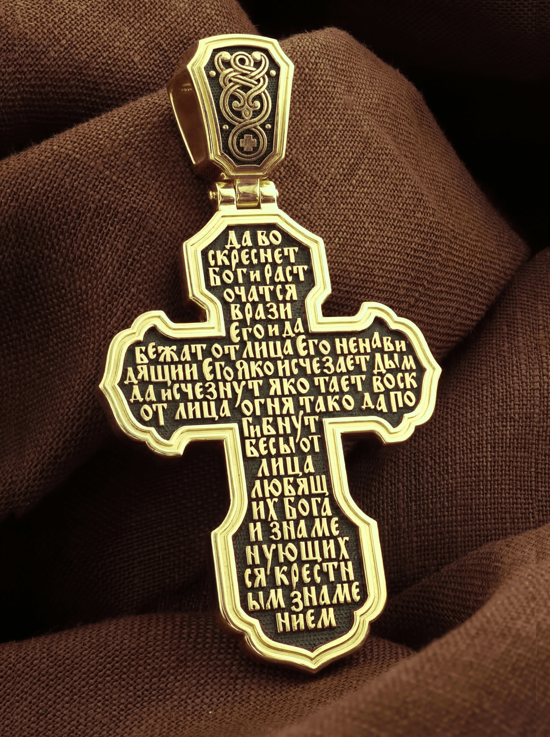 На оборотной стороне креста написана молитва Честному Кресту Господню: «Да воскреснет Бог, и расточатся врази Его, и да бежат от лица Его ненавидящии Его. Яко исчезает дым, да исчезнут; яко тает воск от лица огня, тако да погибнут беси от лица любящих Бога и знаменующихся крестным знамением…».
