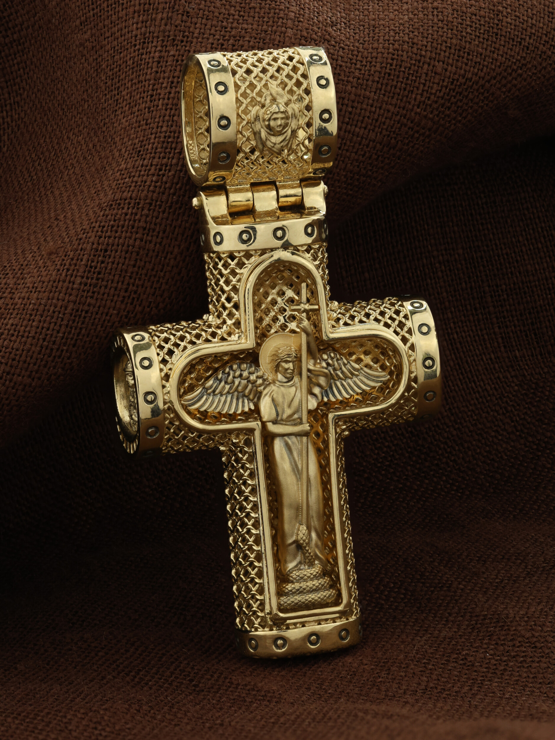 На лицевой стороне креста изображено Распятие Господа и Спасителя нашего Иисуса Христа. Крест- символ спасения и искупления рода человеческого, знамение победы над смертью и адом. Иисус Христос, как искупительная жертва освобождения человечества от власти греха, умер крестной смертью и в третий день воскрес. Распятие сопровождается каноническими надписями. На верхней табличке, выше головы Иисуса, расположена надпись, составленная Понтием Пилатом — «IНЦI». Она означает «Иисус Назорей, Царь Иудейский». Надписи «IC» «ХC», означает Иисус Христос, «НИКА», что означает Победитель, «Царь Славы» и «Сын Божий», размещается на разных сторонах поперечной перекладины креста. Крест стоит на горе камней, символизирующих Голгофу, которая обозначена надписью «Г Г». В ее основании различается череп — это голова Адама, обозначенный надписью «Г А». Надпись «МЛРБ» — «место лобное рай бысть» означает место лобное стало раем. Вдоль креста изображены орудия Страстей Христовых: копие сотника Лонгина, которым пронзили подреберье мёртвого Иисуса, чтобы убедиться в Его смерти, и трость с губкой, с которой Иисуса напоили уксусом. Они обозначены буквами «К» и «Т». На кулонном кольце размещен «Нерукотворный образ Иисуса Христа», на оборотной стороне кулонного кольца- шестикрылый Серафим.