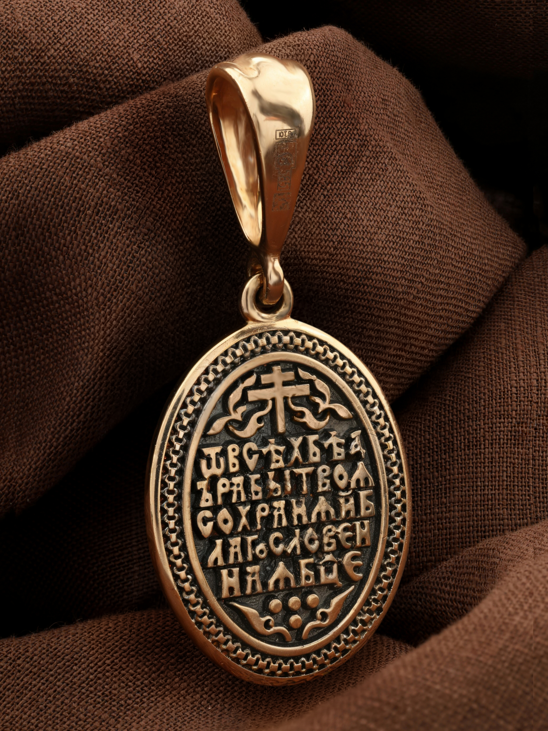 На лицевой части образка изображена Казанская икона Пресвятой Богородицы — одна из самых почитаемых в России. Икона была явлена на пожарище в Казани в 1579 году. В 1904 году святыня была похищена и уничтожена, но чудотворную силу иконы Богородица явила во многих ее списках. Молитва перед Казанской иконой Божьей Матери помогает во всех сложных случаях жизни, во всех печалях, невзгодах, скорбях.