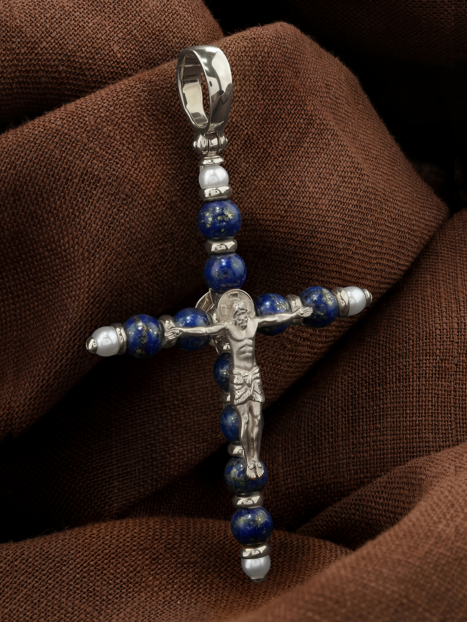 Крест из белого золота c жемчугом и лазуритом