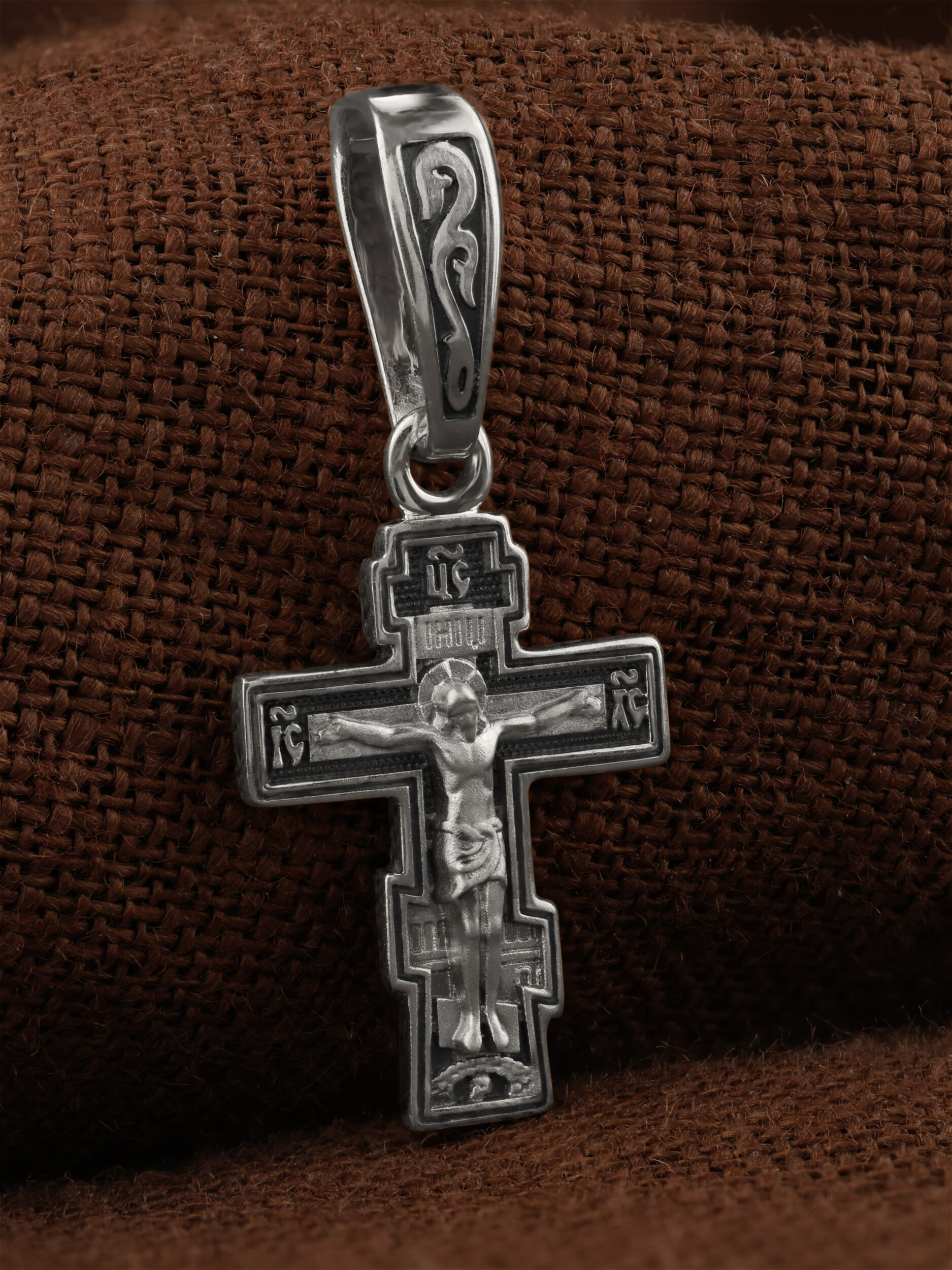 На лицевой стороне креста изображено Распятие Господа и Спасителя нашего Иисуса Христа, отдавшего Себя на смерть для искупления грехов мира. Крест является символом жертвенной любви Всеблагого Бога к падшим людям, всепобеждающим духовным оружием христиан, основанием и средоточием церковной жизни. Над вершиной Распятия помещена надпись «Царь Славы». На верхней перекладине расположена надпись «IНЦI». Она символизирует титло — табличку, на которой, согласно Евангелию, было начертано: Иисус Назорей, Царь Иудейский. Надпись «IC» «ХC»», означает Иисус Христос, помещаются на разных сторонах поперечной перекладины креста. Ниже помещена надпись «НИКА», что означает «победитель». Крест стоит на горе камней, символизирующих Голгофу. Под подножием Креста изображена покоящаяся голова (череп) Адама.