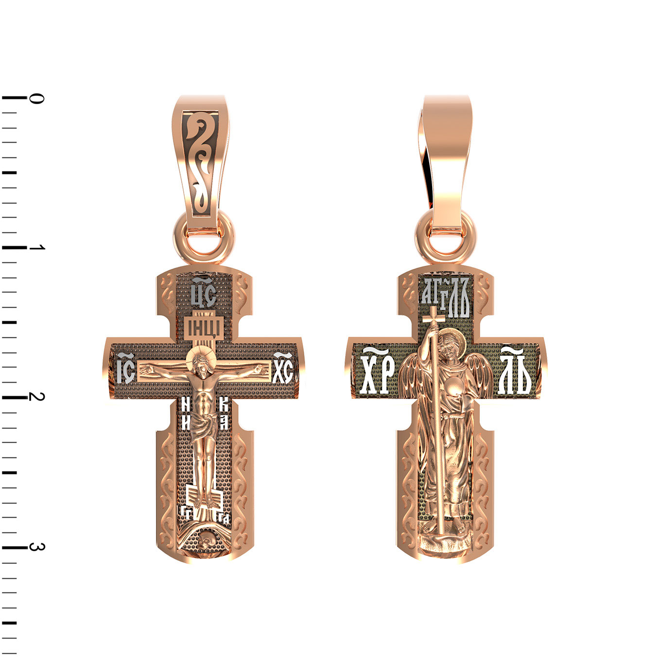 На оборотной стороне креста изображен святой Ангел-Хранитель в виде прекрасного юноши держащего в правой руке крест, а в левой — сферу. Ангел-Хранитель — это Ангел приставляемый Богом к человеку при крещении для охраны и помощи в добрых делах. Невидимо пребывая при нас постоянно, он, руководствуя нас ко спасению, не только по нашему желанию таинственно наставляет нас на все доброе и полезное, не только возносит наши молитвы к Богу, но еще и сам от себя охраняют и защищают нас от врагов видимых и невидимых, ходатайствует за нас пред Богом.