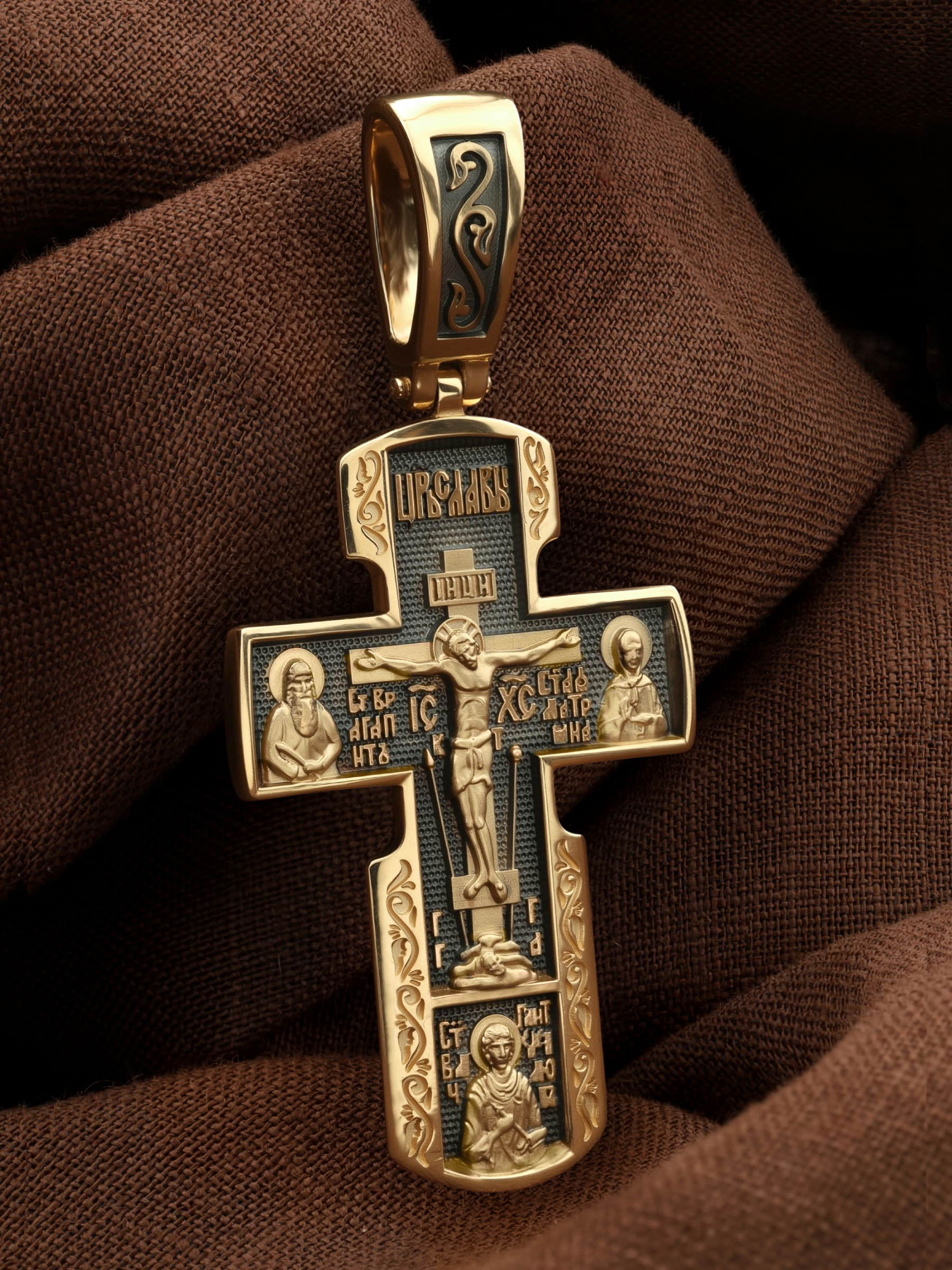 Как действенная помощь в немощах и болезнях был создан крест с образами святых целителей и со знаменитой афонской иконой Божией Матери «Всецарица». На лицевой стороне креста изображено Распятие Иисуса Христа. Над титлом видим слова «ЦРЬ СЛВЫ» — Царь Славы. Верхняя перекладина символизирует собой табличку с надписью «IHЦI» — Иисус Назарянин Царь Иудейский. Под перекладиной пишется сокращенно имя Спасителя «IC XC» — Иисус Христос. Возвышение, на котором стоит Крест, символизирует гору Голгофу, на которой произошло Распятие. У подножия Креста изображают прах Адама, обозначенный черепом. Справа от Распятия помещен образ прославленной святой блаженной Матроны. Слева — икона Преподобный Агапита. Этот святой жил в пещерах Киево-Печерского монастыря в XI веке и бескорыстно врачевал мирян и монахов. У основания Креста Господня изображен великомученик Пантелеимон Целитель. Господь даровал удивительную силу его молитве. Ею он исцелял любые болезни и даже воскрешал умерших.