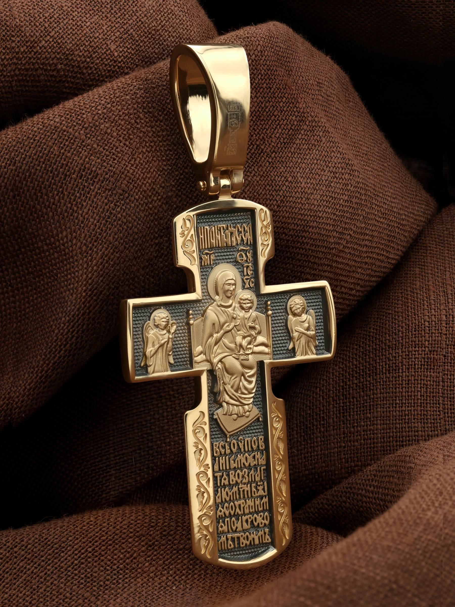 Весь оборот креста занимает икона Божией Матери «Всецарица». Внизу креста написана молитва обращенная к Божией Матери «Все упование мое на Тя возлагаю, Мати Божия, сохрани мя под кровом Твоим».