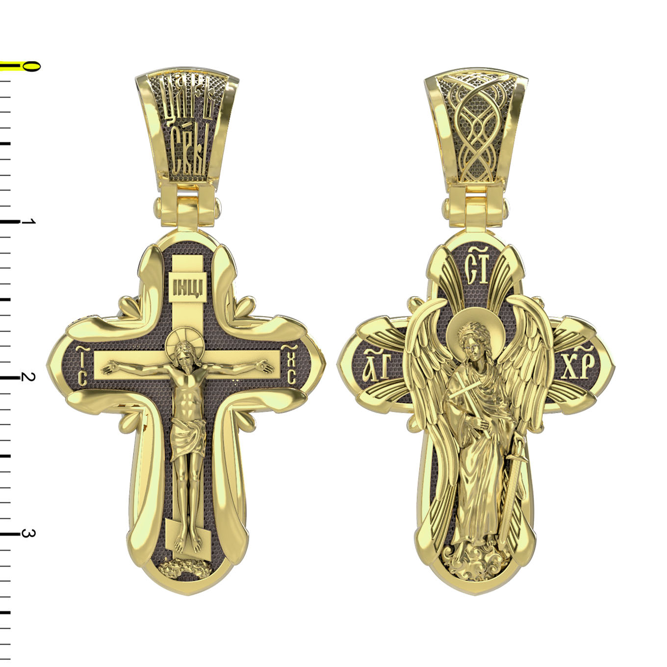 На оборотной стороне креста изображен Святой Ангел-Хранитель держащий в правой руке крест, а в левой — мечь.. Ангел-Хранитель — это Ангел приставляемый Богом к человеку при крещении для охраны и помощи в добрых делах. Он невидимо находится при человеке на протяжении всей его жизни, если человек сохраняет в себе любовь к Богу и истинную веру перед Ним. Ангел-Xранитель делают для нас все, что служит к истинному нашему благу и спасению. Невидимо пребывая при нас постоянно, он, руководствуя нас ко спасению, не только по нашему желанию таинственно наставляет нас на все доброе и полезное, не только возносит наши молитвы к Богу, но еще и сам от себя охраняют и защищают нас от врагов видимых и невидимых и ходатайствует за нас пред Богом. Ангел-Хранитель так любит нас, как никто на земле любить не может. Ангел-Хранитель — присный друг наш, незримый тихий собеседник, пресладостный утешитель. Одного лишь каждому из нас он желает — спасения души; к этому он направляет все свои заботы. И если видит нас также заботящимися о спасении, радуется, если же видит нас пребывающими в нерадении о душе своей, скорбит. Но и самый великий грешник может примириться со своим Ангелом-Хранителем посредством искреннего раскаяния в грехах и оставления их навсегда. В таком случае, по слову Писания, великая радость бывает для всех ангелов на небесах (Лк. 15:10).