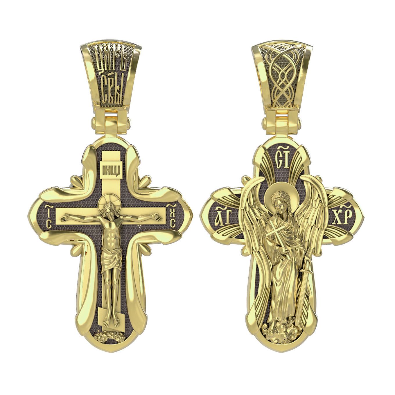 На лицевой стороне креста изображено Распятие Господа и Спасителя нашего Иисуса Христа, отдавшего Себя на смерть, для искупления грехов мира. Крест является символом жертвенной любви Всеблагого Бога к падшим людям, всепобеждающим духовным оружием христиан, основанием и средоточием церковной жизни. Господь сказал: кто хочет идти за Мною, отвергнись себя, и возьми крест свой, и следуй за Мною. (Мк. 8: 34). Над вершиной Распятия, на кулонном кольце, помещена надпись «Царь Славы». На верхней табличке, выше головы Иисуса, расположена надпись, составленная Понтием Пилатом — «IНЦI». Она означает «Иисус Назорей, Царь Иудейский». Надпись «IC» «ХC», означает Иисус Христос, помещается на разных сторонах поперечной перекладины креста. Крест стоит на горе камней, символизирующих Голгофу.