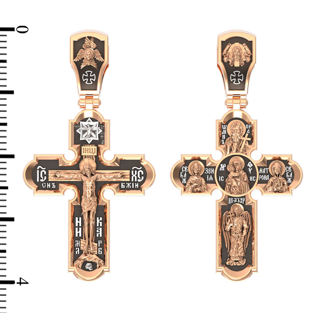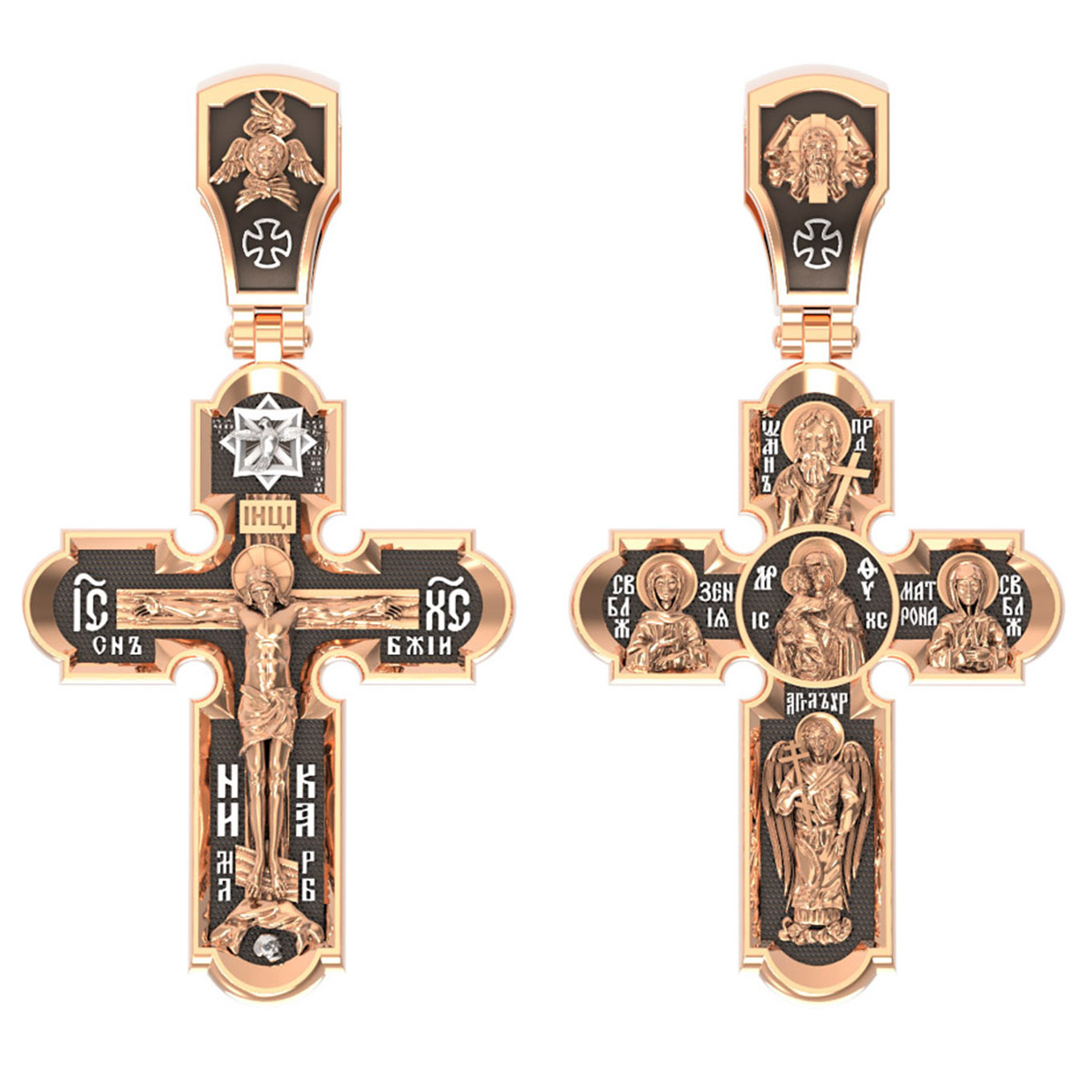 На лицевой стороне креста изображено Распятие Иисуса Христа. Господь представлен свободно покоящимся на кресте с простертыми руками и как бы обнимающим всю Вселенную. Верхняя перекладина символизирует титло — табличку, на которой, согласно Евангелию, было начертано: Иисус Назорей Царь Иудейский (IНЦI). Также Распятие сопровождается надписями, олицетворяющими Христа: святое имя Христа «IC» (Иисус) «ХС» (Христос), и словосочетание «СНЪ БЖIЙ» — СЫН БОЖИЙ. Рядом с образом Христа помещены слова — «НИКА» (греч. — Победитель) и четыре буквы «МЛ» «РБ» — Место Лобное Рай Бысть. Возвышение, на котором стоит Крест, символизирует гору Голгофу, на которой произошло Распятие. У подножия Креста изображают прах Адама, обозначенный черепом. На кулонном кольце изображен шестикрылый Серафим — самый приближенный к Господу Ангел.