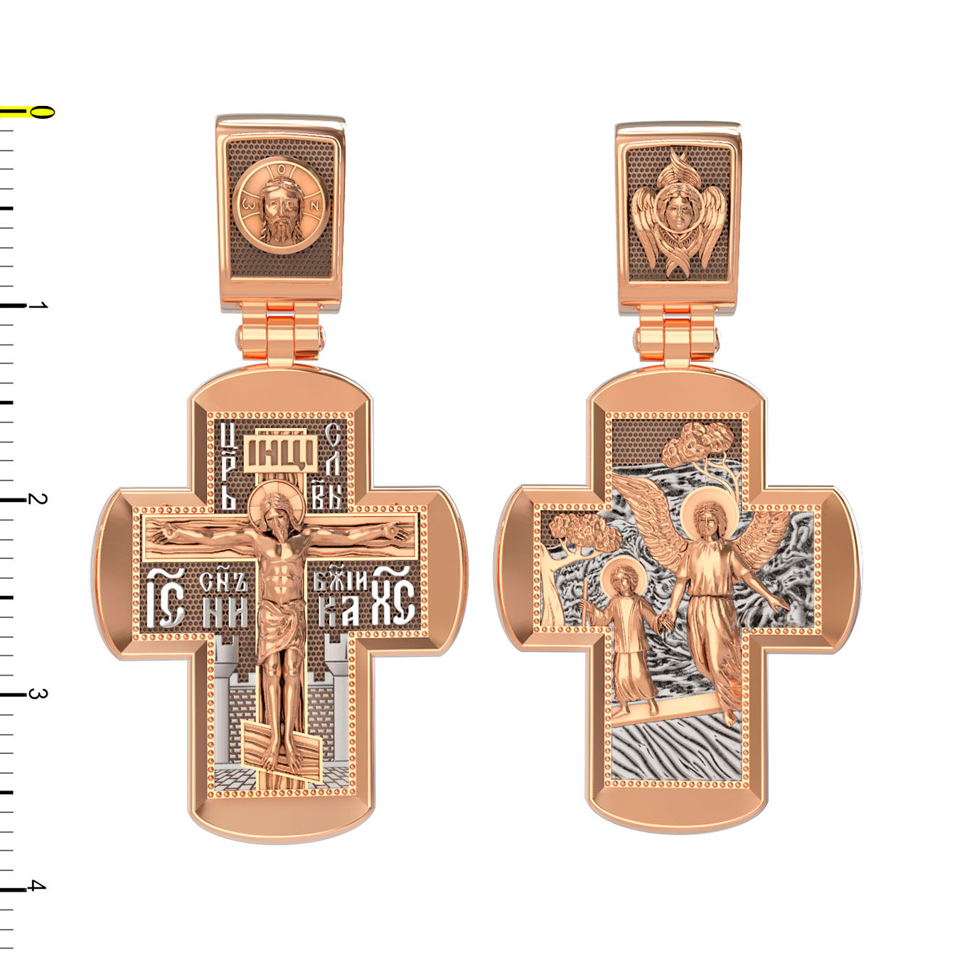 На оборотной стороне креста изображен святой Ангел-Хранитель, ведущий человеческую душу, которая представлена в виде ребёнка. Ангел-Хранитель — это Ангел приставляемый Богом к человеку при крещении для охраны и помощи в добрых делах. Он невидимо находится при человеке на протяжении всей его жизни, если человек сохраняет в себе любовь к Богу и истинную веру перед Ним. Ангел-Xранитель делают для нас все, что служит к истинному нашему благу и спасению. Невидимо пребывая при нас постоянно, он, руководствуя нас ко спасению, не только по нашему желанию таинственно наставляет нас на все доброе и полезное, не только возносит наши молитвы к Богу, но еще и сам от себя охраняют и защищают нас от врагов видимых и невидимых и ходатайствует за нас пред Богом. Одного лишь каждому из нас он желает — спасения души; к этому он направляет все свои заботы. И если видит нас также заботящимися о спасении, радуется, если же видит нас пребывающими в нерадении о душе своей, скорбит. Но и самый великий грешник может примириться со своим Ангелом-Хранителем посредством искреннего раскаяния в грехах и оставления их навсегда. В таком случае, по слову Писания, великая радость бывает для всех ангелов на небесах (Лк. 15:10). На кулонном кольце изображен Серафим.