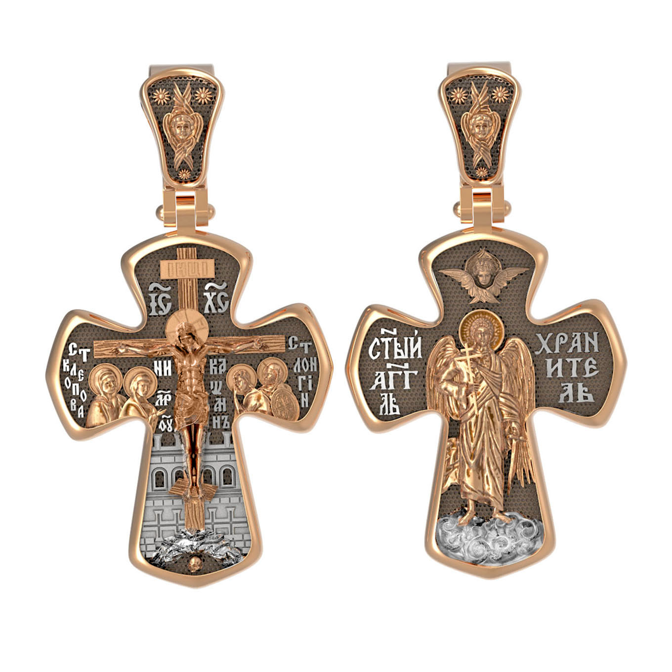 На лицевой стороне креста изображено Распятие Господа и Спасителя нашего Иисуса Христа, отдавшего Себя на смерть, для искупления грехов мира. Господь сказал: кто хочет идти за Мною, отвергнись себя, и возьми крест свой, и следуй за Мною. (Мк. 8: 34). Крест является символом жертвенной любви всеблагого Бога к падшим людям, всепобеждающим духовным оружием христиан, основанием и средоточием церковной жизни. На верхней перекладине помещена надпись «IС» « ХС», что означает Иисус Христос. Ниже — слово «НИКА», что означает «победитель». Слева от Распятия изображена Пресвятая Богородица, справа — апостол и евангелист Иоанн Богослов, один из ближайших учеников Иисуса Христа. За Распятием высится Иерусалимская стена, в знак того, что Господь был распят вне стен города. Возвышение, на котором стоит Крест, символизирует гору Голгофу, на которой произошло Распятие. Под подножием Креста изображена покоящаяся голова (череп) Адама. На кулонном кольце помещен крест.