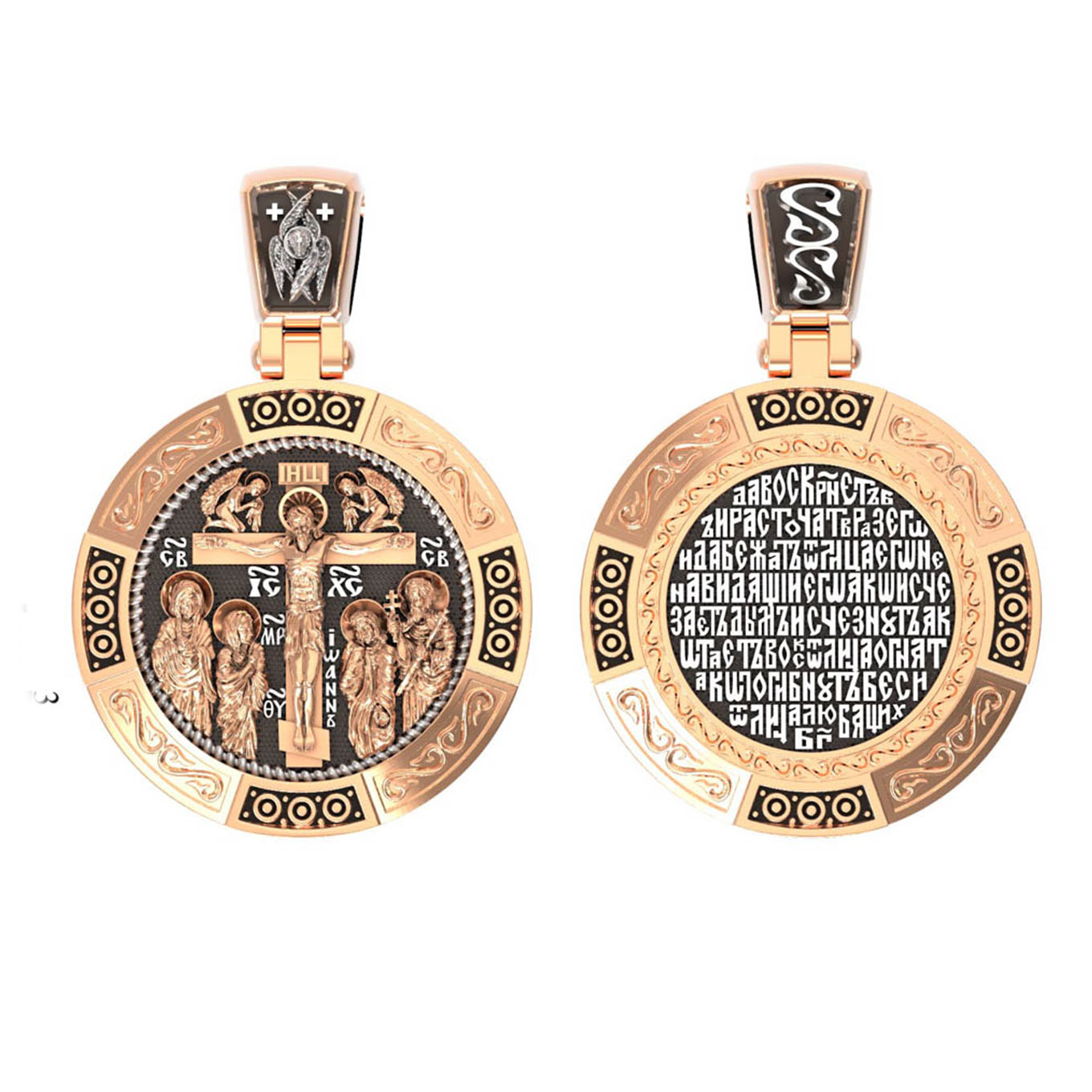 На лицевой стороне образка изображено Распятие Господа Иисуса Христа с предстоящими Ему святыми, которые, по преданию, находились у Креста Господа во время Его казни. Слева — Пресвятая Богородица и св. Мария Клеопова, справа — апостол Иоанн Богослов и мч. Лонгин Сотник.