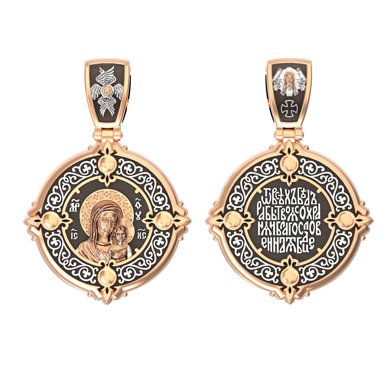 На обороте написана молитва к Богородице: «От всех бед рабы Твоя сохраняй, Благословенная Богородица!». На кулонном кольце изображен Спас Нерукотворный — Символ вочеловечившегося Божества и шестикрылый Серафим — самый приближенный к Господу Ангел.