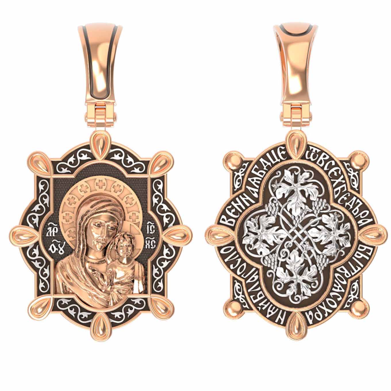 На лицевой части образка изображена Казанская икона Пресвятой Богородицы — одна из самых почитаемых в России чудотворных икон Богородицы. Богословское значение Казанской иконы — указать верующим истинный Путь к спасению, который лежит через Христа. Только Божия Матерь имеет настолько сильное дерзновение к Спасителю, что может ходатайствовать перед Ним за всех верных. Именно этот образ дарится новой повенчанной паре, как хранитель очага и семейная реликвия. Молитва перед Казанской иконой Божьей Матери помогает во всех сложных случаях жизни, в болезнях, во всех печалях, невзгодах, скорбях. Уникальная история появления, чудеса, случившиеся по молитвам православных людей возле образа — все это делает Казанскую Богородицу особенной, среди тысяч других икон.