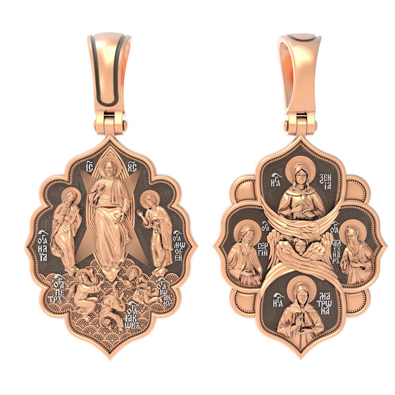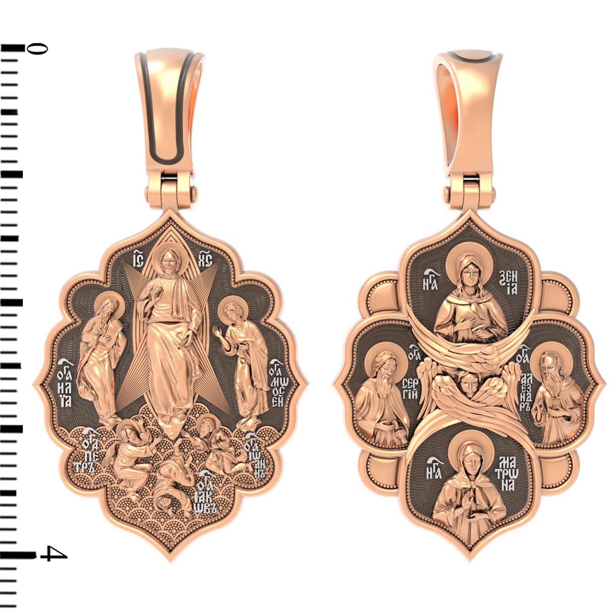 Вверху образка изображена блаженная Ксения Петербургская. После смерти супруга приняла на себя подвиг юродства, чтобы отмолить его перед Богом. Ксения раздала имущество, одела мундир мужа и назвалась его именем, уверяя всех, что умер не он, а она сама. С этого времени в течение 45 лет блаженная скиталась по улицам Петербурга. Ксения сподобилась дара прозрения будущего и человеческих сердец, а также особой помощи в устроении жизни. Эти чудеса она продолжает творить и за гробом.