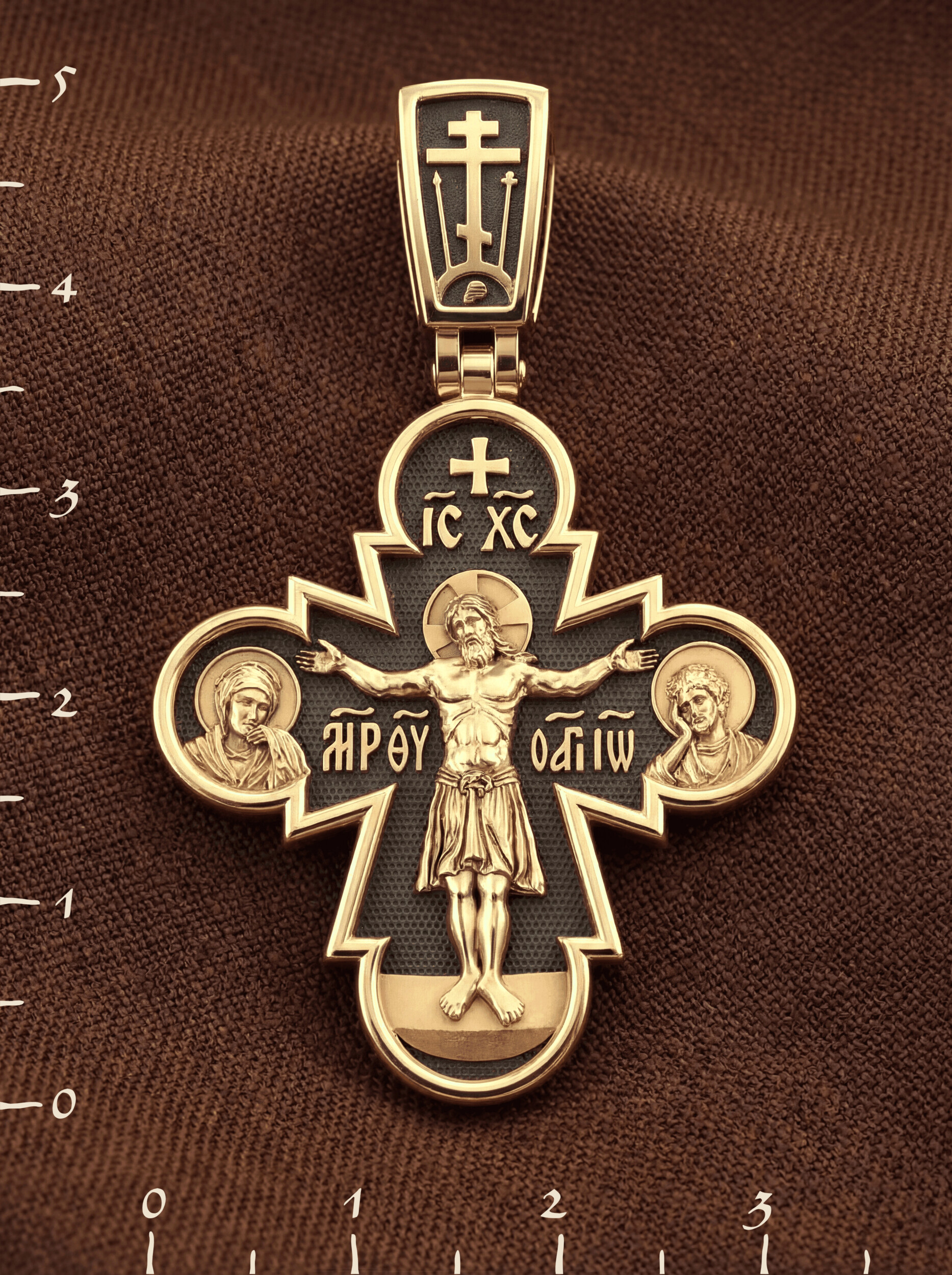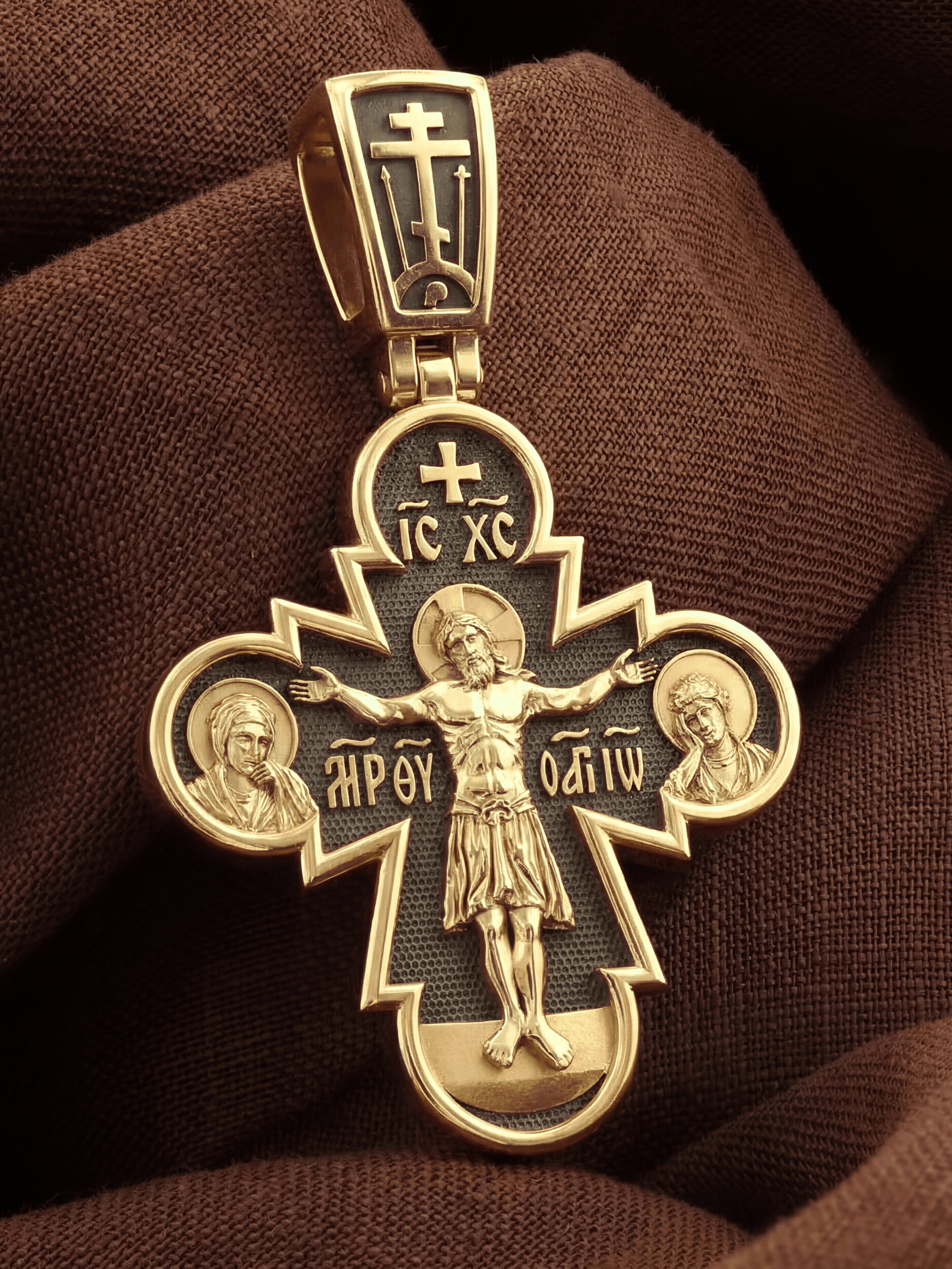 На лицевой стороне этого креста Иисус Христос является как Господь, Творец мира и его Грозный Судия, царящий на Небесах. Православная иконография показывает нам распятого Господа не в виде мучительно умирающего человека, а как величественного и всесильного Бога, который простирает руки, словно обнимает весь мир. Человеческие страдания Господа обычно только обозначаются наклоном Его головы и полузакрытыми глазами. С двух сторон Христу предстоят Пресвятая Богородица и Святой апостол и Евангелист Иоанн Богослов.