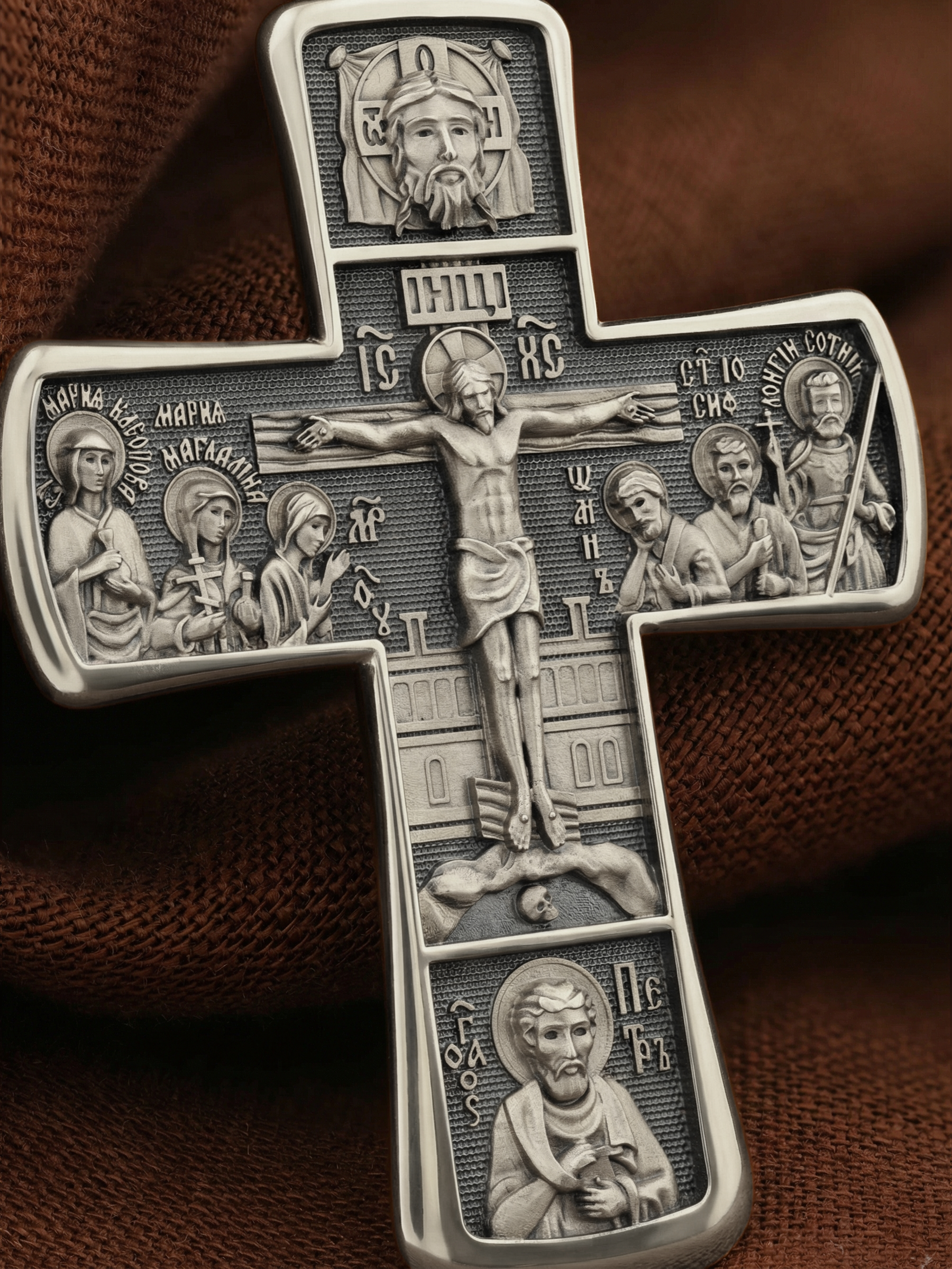 На лицевой стороне креста изображено Распятие Господа Иисуса Христа с предстоящими Ему святыми, которые, по преданию, находились у Креста Господа во время Его казни. Слева — Пресвятая Богородица и жены-мироносицы — равноапостольная Мария Магдалина и святая Мария Клеопова, справа — апостол Иоанн Богослов, прав. Иосиф Аримофейский и мч. Лонгин Сотник.