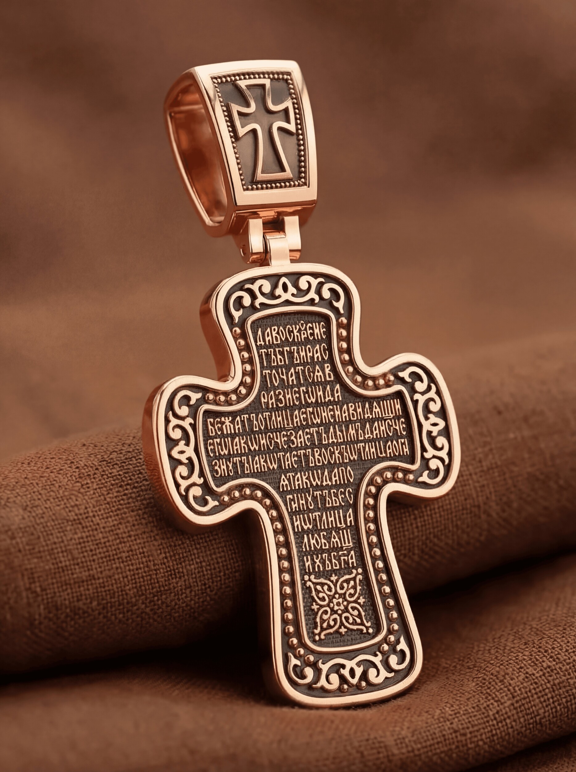 Распятие сопровождается каноническими надписями. Это святое имя Христа, которое принято писать на иконах сокращенно — «ИС ХС», словосочетание «СЫН БОЖИЙ», что означает божественную природу Иисуса Христа. Рядом с Его образом помещены слова «Царь Славы». Над головой Господа на поперечной перекладине аббревиатура «IНЦI», что символизирует табличку, которая была прибита к Кресту, с надписью «Иисус Назорей Царь Иудейский». На кулонном кольце помещено изображение Серафима.