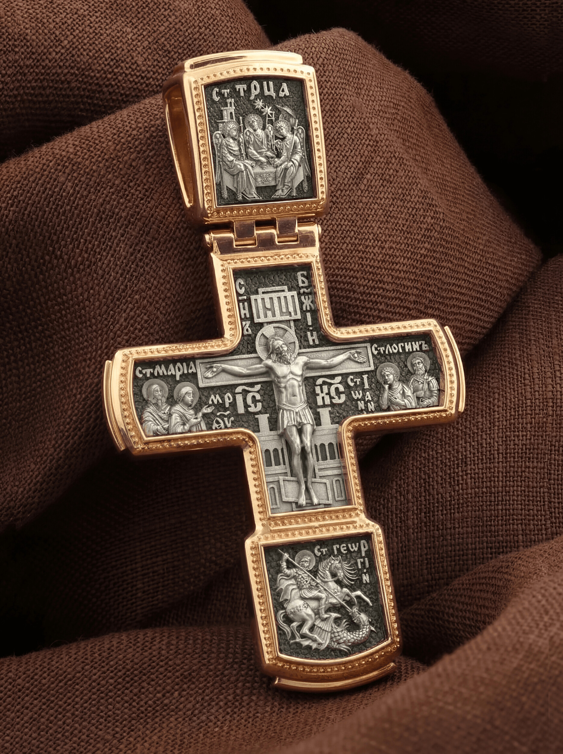 На кресте изображено Распятие Господа нашего Иисуса Христа. Ему предстоят Святая Мария Магдалина, Пресвятая Богородица, апостол Иоанн и Святой Иосиф, свидетели крестных страданий Господа. На оглавии помещена икона Святой Троицы, на которой запечатлено явление Триединого Бога праотцу Аврааму в виде трех ангелов. В нижнем клейме изображено Чудо Святого Георгия о змие. Великомученик Георгий почитается как покровитель воинов, защитник от злых сил, помощник в духовной борьбе.