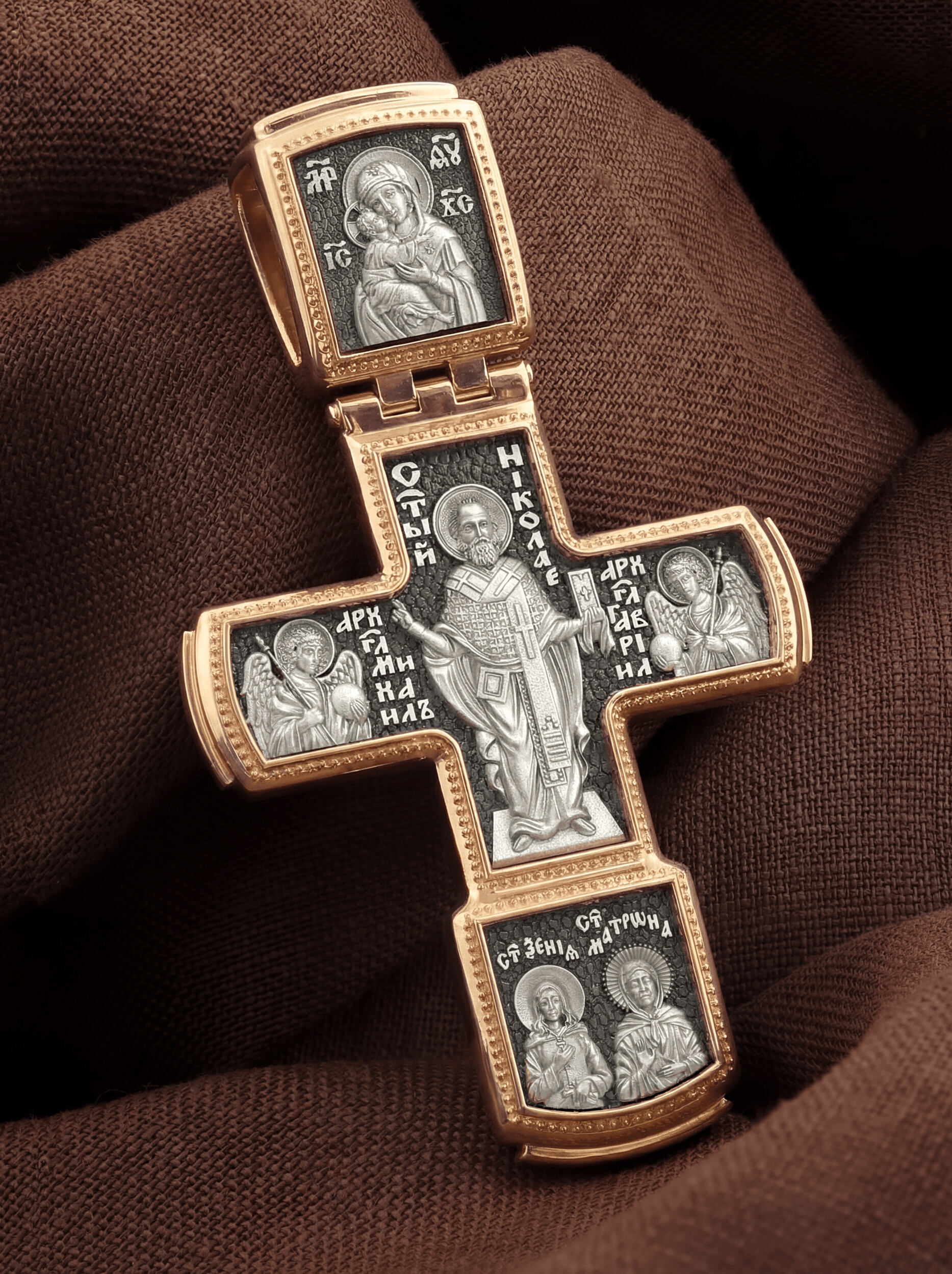 В центре на обороте — самый почитаемый в Православной Церкви святой, Николай Чудотворец, которого еще называют Николай Угодник за то, что он угодил своей жизнью Богу. Ему молятся, отправляясь в путешествие, особенно по морю, просят исцеления в различных недугах, помощи в торговых делах, учебе и поисках достойного супруга. С двух сторон от Николая Чудотворца помещены образы архангелов Михаила и Гавриила. Вверху — Владимирская икона Божией Матери — самая великая русская святыня, многие века бывшая олицетворением нашей земли. Перед ней венчались на царство государи, избирались патриархи. Пречистой Богородице Владимирской клялись в верности Отечеству солдаты и за нее умирали на поле брани. Именно на ее защиту более всего уповала Россия в самые страшные периоды своей истории. В нижнем клейме — иконы двух святых помощниц от всех недугов, блаженных Ксении Петербургской и Матроны Московской.