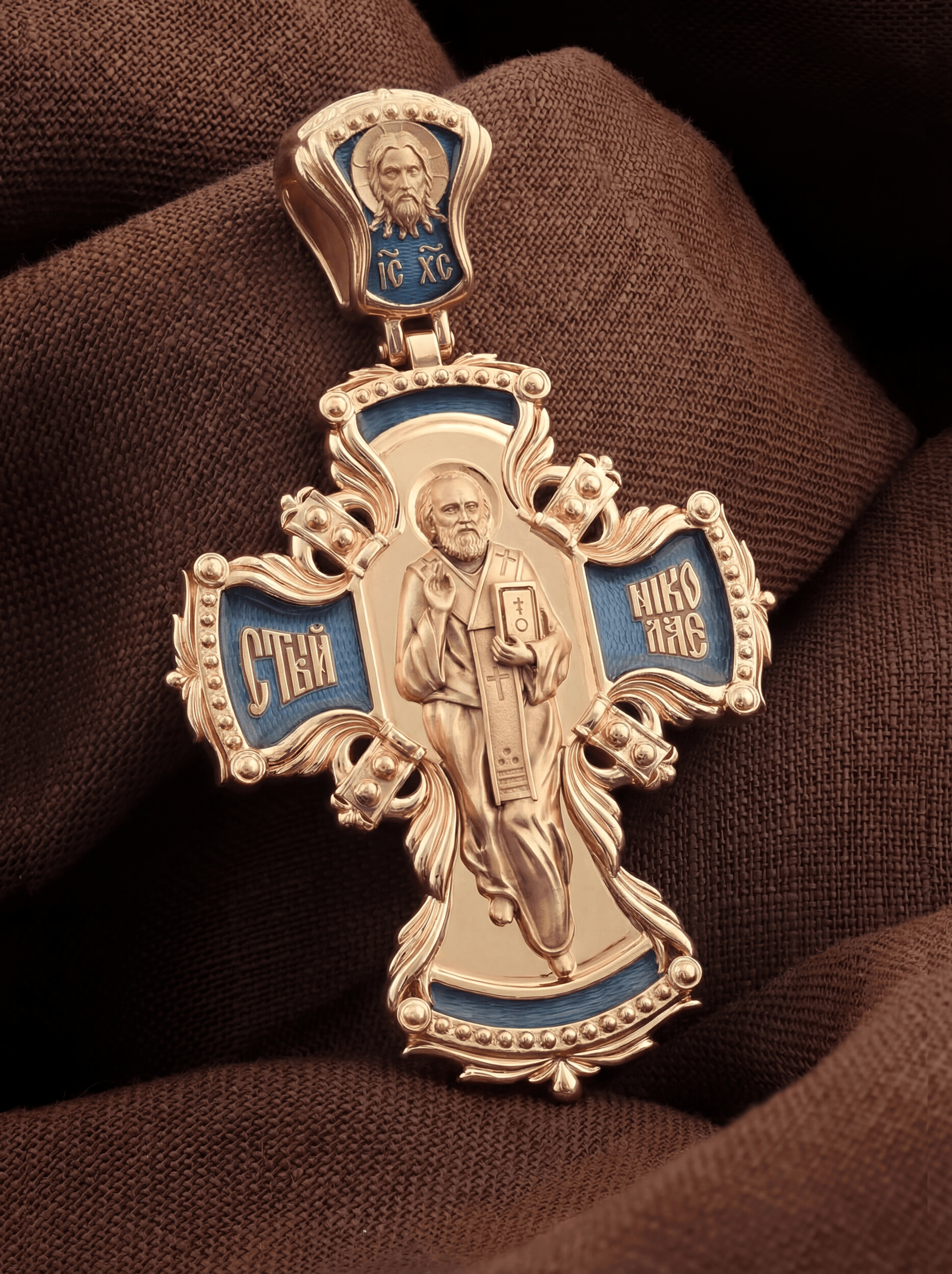Оборотную сторону креста возглавляет икона святителя Николая Чудотворца, самого почитаемого святого не только в России, но и во всем мире. Николай Чудотворец, помощник в делах, защитник путешествующих, покровитель учащихся, утешитель обиженных и нуждающихся, целитель самых страшных и тяжелых недугов, предстатель и молитвенник за людей перед Богом. На кулонном кольце помещено изображение Спаса Нерукотворного — образ Спасителя, который Он запечатлел на плате и передал для исцеления больному проказой царю Эдессы.