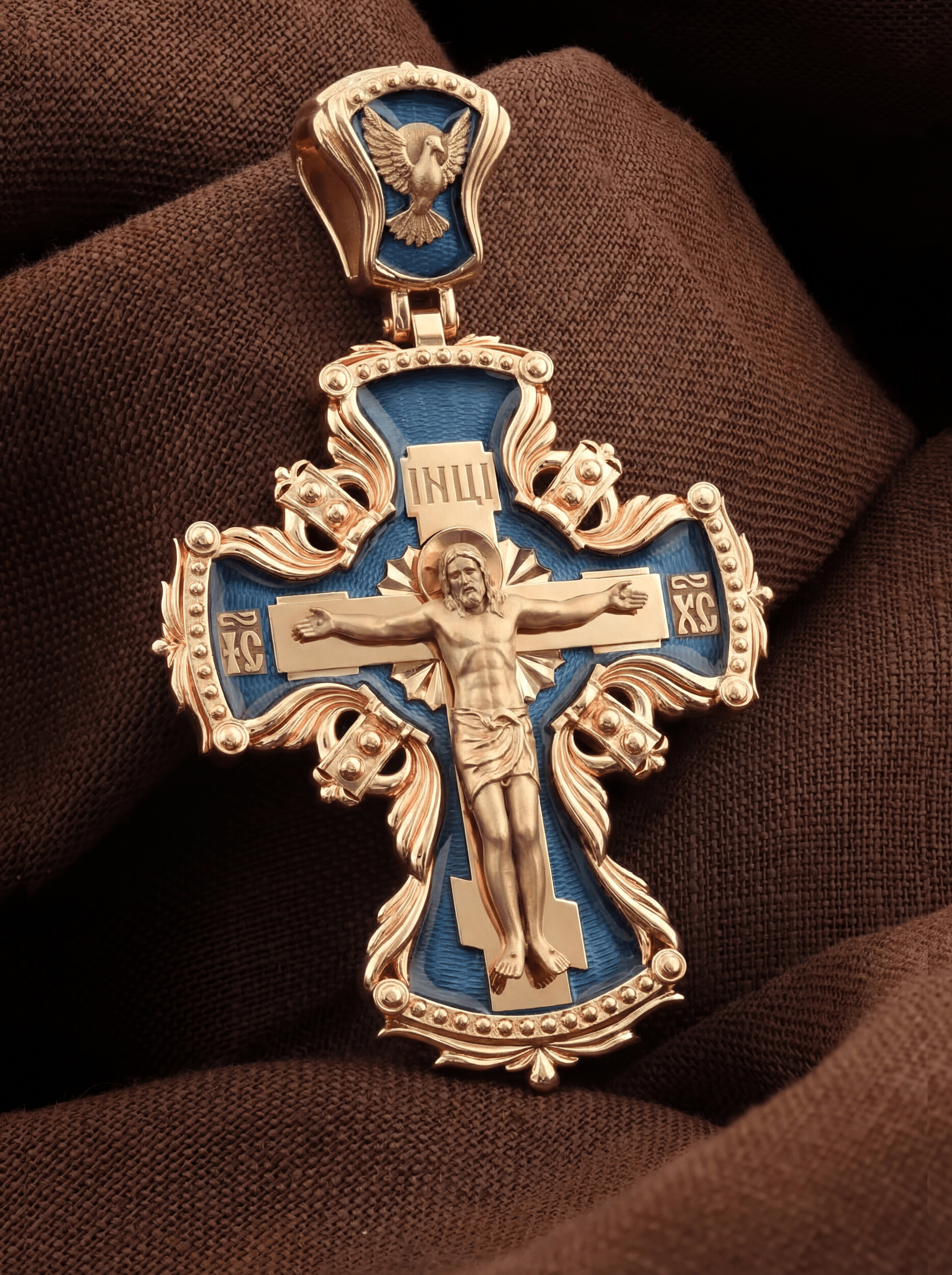 Центральную часть лицевой стороны занимает Распятие Христа — образ жертвы, принесенной Господом за грехи людей. Именно ко Христу, сошедшему на землю ради нашего спасения, возносятся все молитвы. Рядом с Его образом помещены слова — «НИКА» и «СЫН БОЖИЙ». Эти слова характеризуют Господа как Великого Архиерея, победителя смерти. Также Распятие сопровождается надписями, олицетворяющими Христа — это святое имя Христа «IC» (Иисус) «ХС» (Христос). На кулонном кольце изображен голуь — символ Святого Духа.