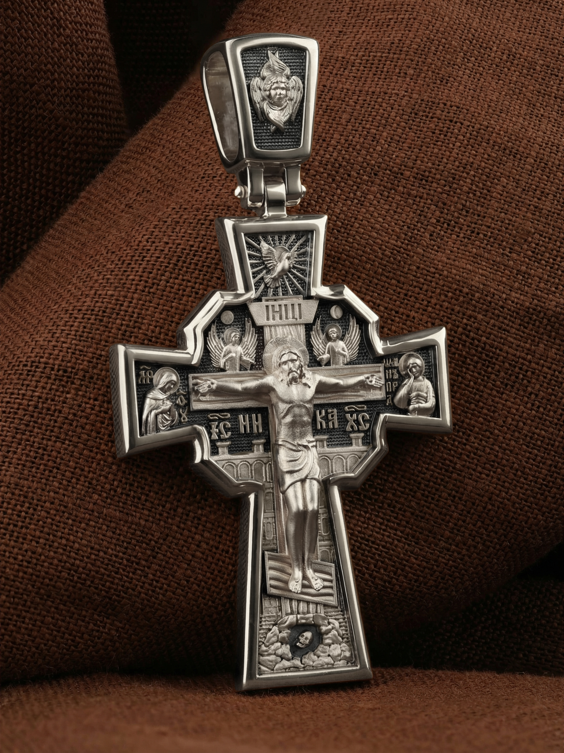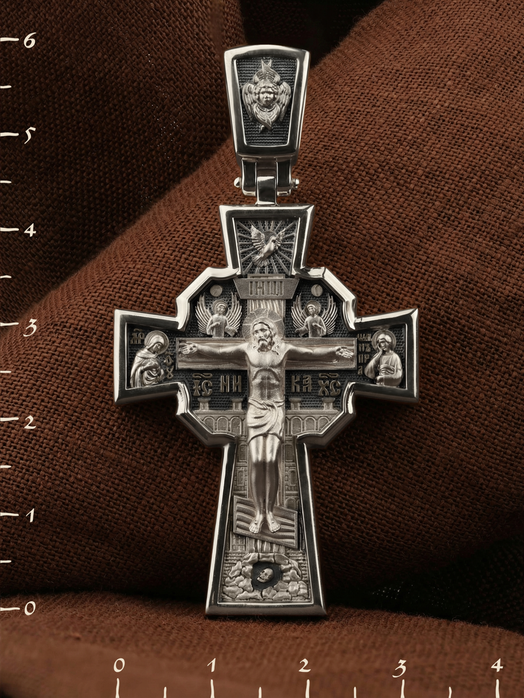 На лицевой стороне креста изображено Распятие Господа и Спасителя нашего Иисуса Христа, отдавшего Себя на смерть, для искупления грехов мира. Верхняя перекладина символизирует титло — табличку, на которой, согласно Евангелию, было начертано: Иисус Назорей Царь Иудейский (IНЦI). Распятие сопровождается надписями, олицетворяющими Христа. Надпись «IС» « ХС», что означает Иисус Христос, и слово «НИКА», что означает «победитель», помещаются ниже поперечной перекладины креста. Над вершиной Распятия помещено изображение Святого Духа, в виде голубя сходящего с небес, и двух Ангелов. Слева от Распятия изображена Пресвятая Богородица, справа — апостол и евангелист Иоанн Богослов, один из ближайших учеников Иисуса Христа. За крестом высится Иерусалимская стена, в знак того, что Господь был распят вне стен города. Возвышение, на котором стоит Крест, символизирует гору Голгофу, на которой произошло Распятие. Под подножием Креста изображена покоящаяся голова (череп) Адама. На кулонном кольце помещено изображение шестикрылого Серафим.