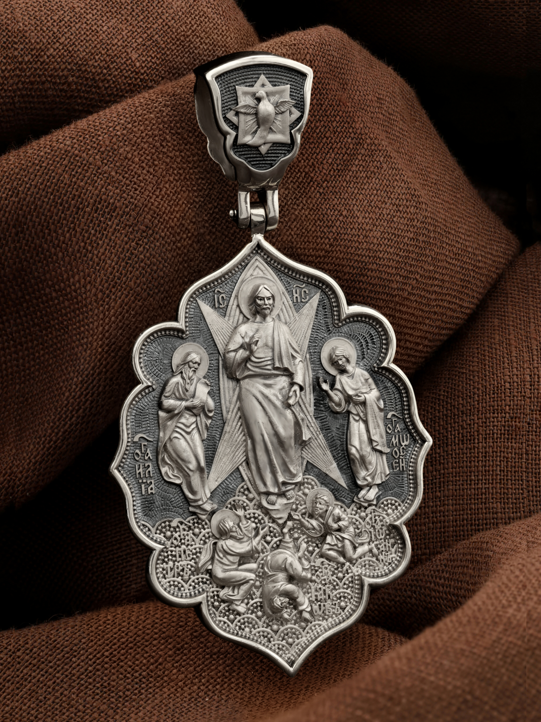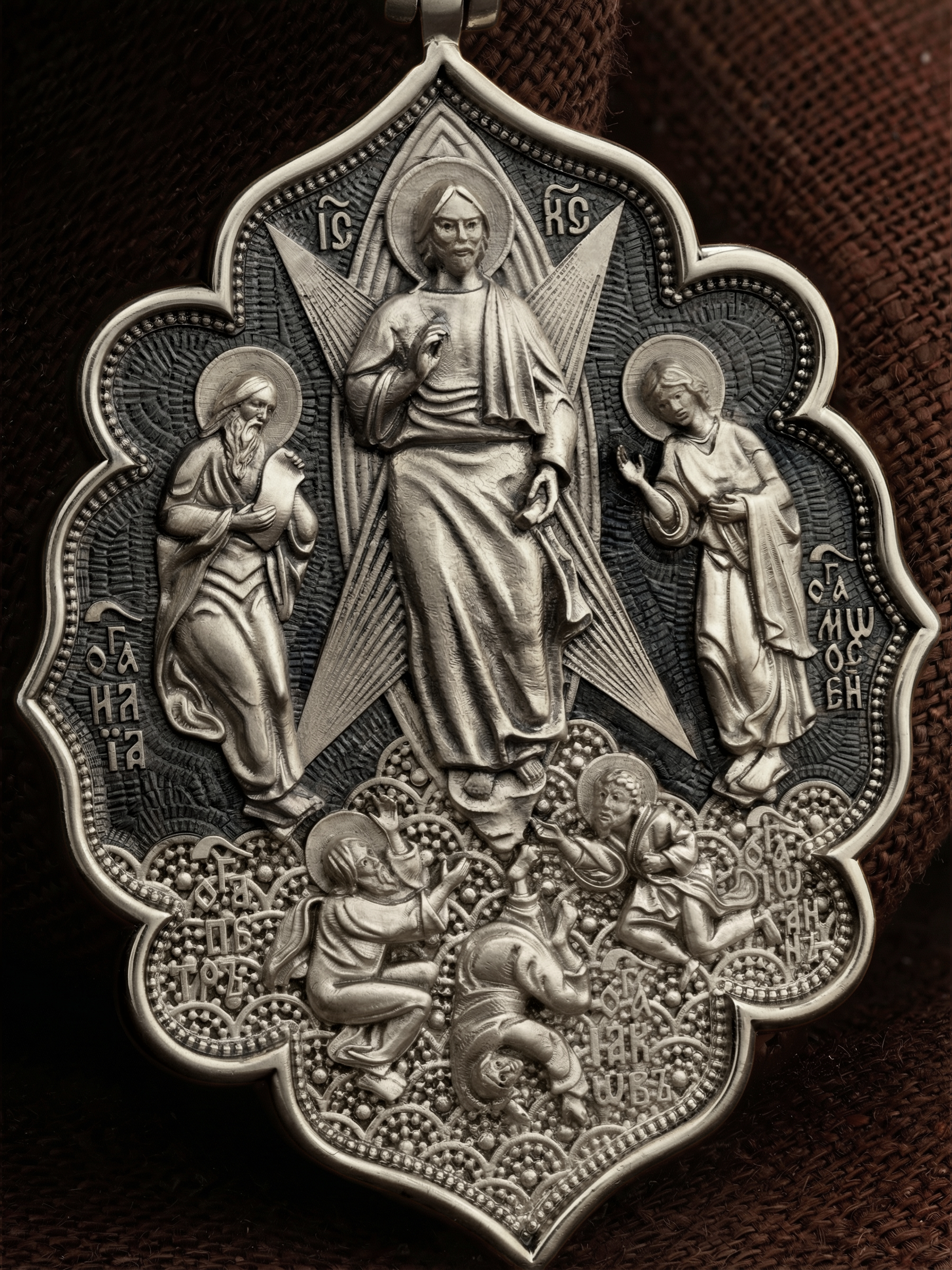 На лицевой стороне образка изображена икона «Преображения Господня». Преображение — одно из немногих Евангельских событий, которое по канону можно изображать не только там, где оно реально происходило. Преображение Господне на иконах можно увидеть на фоне посвященных ему монастырей и храмов. Это объясняется тем, что каждый христианский храм является духовным Фавором, где в церковных таинствах и молитве душа верующих приближается к своему преображению. Образ являет Господа Иисуса Христа в тот момент, когда Он предстал трем Своим ученикам: Петру, Иакову и Иоанну Богослову. Пророки Моисей и Илия предстояли рядом и беседовали с Ним. Апостолы едва могли вынести бесконечную радость, которая охватила их в присутствии Бога. Когда же на гору спустилось облако и раздался глас Божий: «Сей есть Сын Мой Возлюбленный; Его слушайте», апостолы в сильном страхе пали на землю (Лк. 9:35). На иконах «Преображение Господне» они так и изображаются — лежащими у ног Христа. Во главе образка изображен парящий голубь — символ Святого Духа и Его благодати.