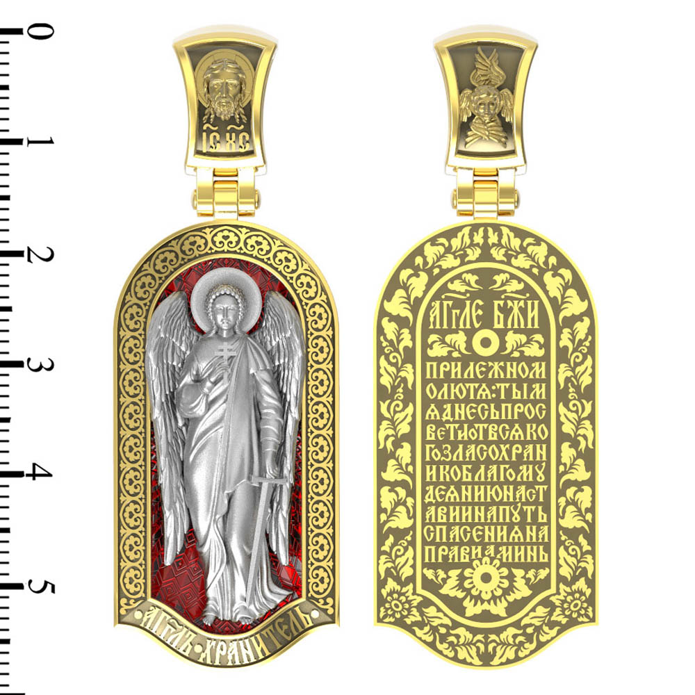 Основой композиции лицевой стороны является Ангела Хранителя. Образок Ангел Хранитель — это не просто украшение, а настоящая миниатюрная икона. В руках Ангел держит традиционные символические атрибуты Ангелов Хранителей: крест — знак послушания Христу и следования Его заповедям, меч — символ непримиримой борьбы, которую он ведет с бесами, отражая их нападения на людей. Слово «ангел» означает «вестник». Ангелы — верные служители Божьи, которых Господь посылает возвещать Свои повеления. Ангелы тварны, как и люди, но имеют другую природу. На иконах они изображаются в человеческом обличье с большими крыльями. Могучие крылья ангелов символизируют быстроту, с которой они исполняют повеления Бога, а небольшие ленточки у ушей –тороки, или слухи — показывают, что они всегда слышат Его голос.