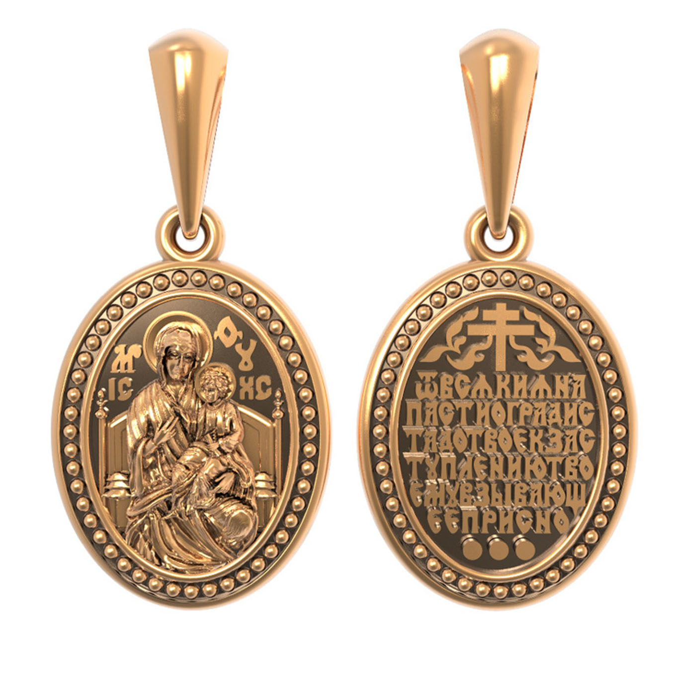 На обороте образка написана молитва Богородице в честь Ее иконы «Всецарица» (Пантанасса): «От всякия напасти огради стадо Твое, к заступлению Твоему взывающее присно».