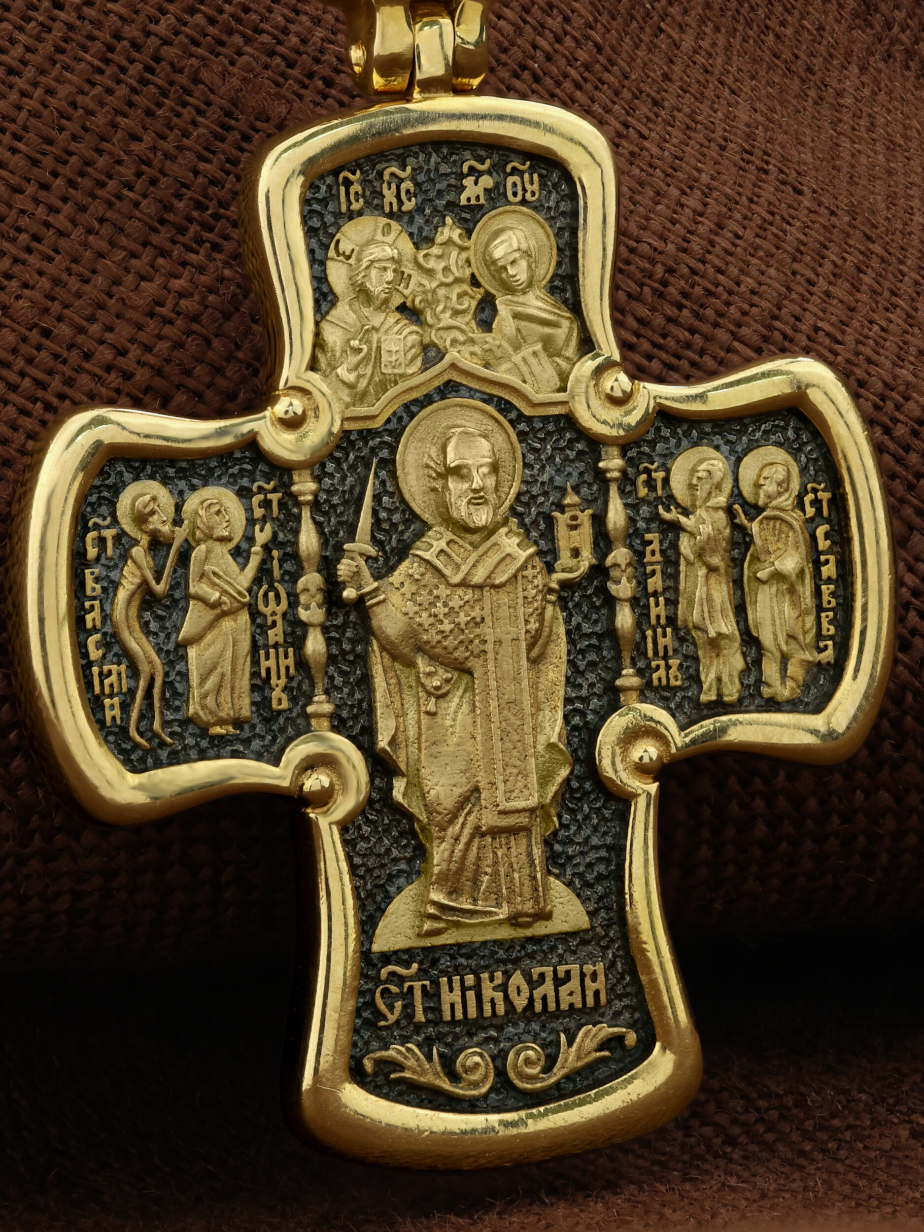 На обороте креста помещена икона самого почитаемого на Руси Святого — Николая Чудотворца (втор. пол. III в.).В руках Они держат знаки епископского достоинства. Чудотворец получил омофор и Евангелие лично из рук Богородицы и Спасителя как защитник и проповедник веры. С двух сторон от Святителя Николая помещены образы великих московских святых, прославившихся чудесами на всю Россию. Слева стоят Христа ради юродивые XVI века: Василий Блаженный, в честь которого назван самый знаменитый русский собор на Красной площади в Москве, и Иоанн Большой Колпак, блаженный, который похоронен в этом храме вместе с Василием Блаженным. Слева — преподобные чудотворцы Даниил Московский, младший сын Александра Невского, и Савва Сторожевский. Оба святых были основателями великих русских монастырей XIV века — Свято-Данилова в Москве и Саввино-Сторожевского в Звенигороде.