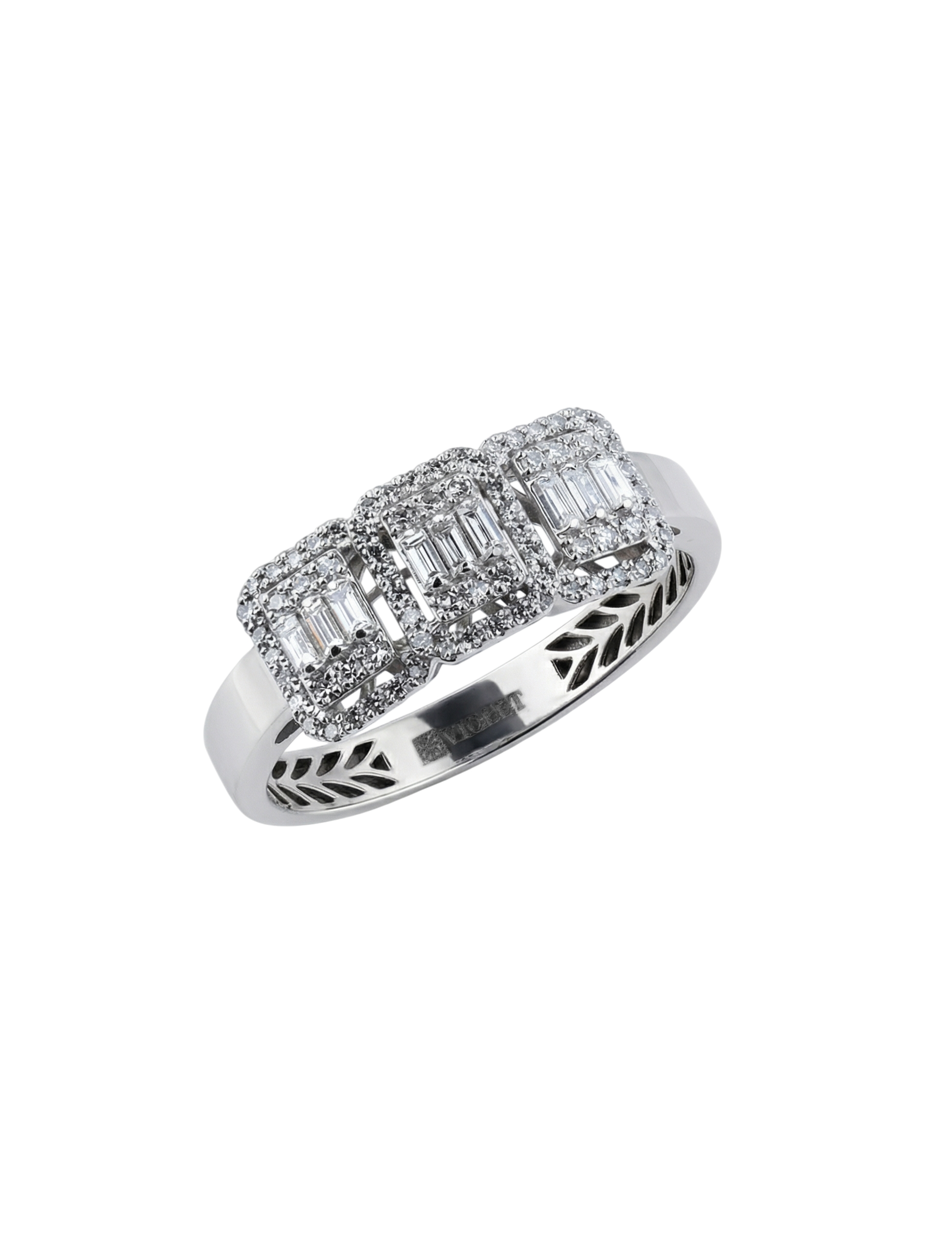 Роскошное кольцо из белого золота 585 пробы станет центральным акцентом вашего образа. Дизайн украшения, представленного в коллекции De Luxe Бриллианты — Baguette, строится на эффектной игре света и строгой геометрии. Мастера использовали сочетание двух типов огранки: благородные бриллианты формы багет создают глубокое сияние в центре композиции, а классические круглые бриллианты обрамляют их, подчеркивая безупречную чистоту линий. Всего в изделии закреплена 81 вставка с белым цветом, что обеспечивает невероятный блеск при любом освещении.