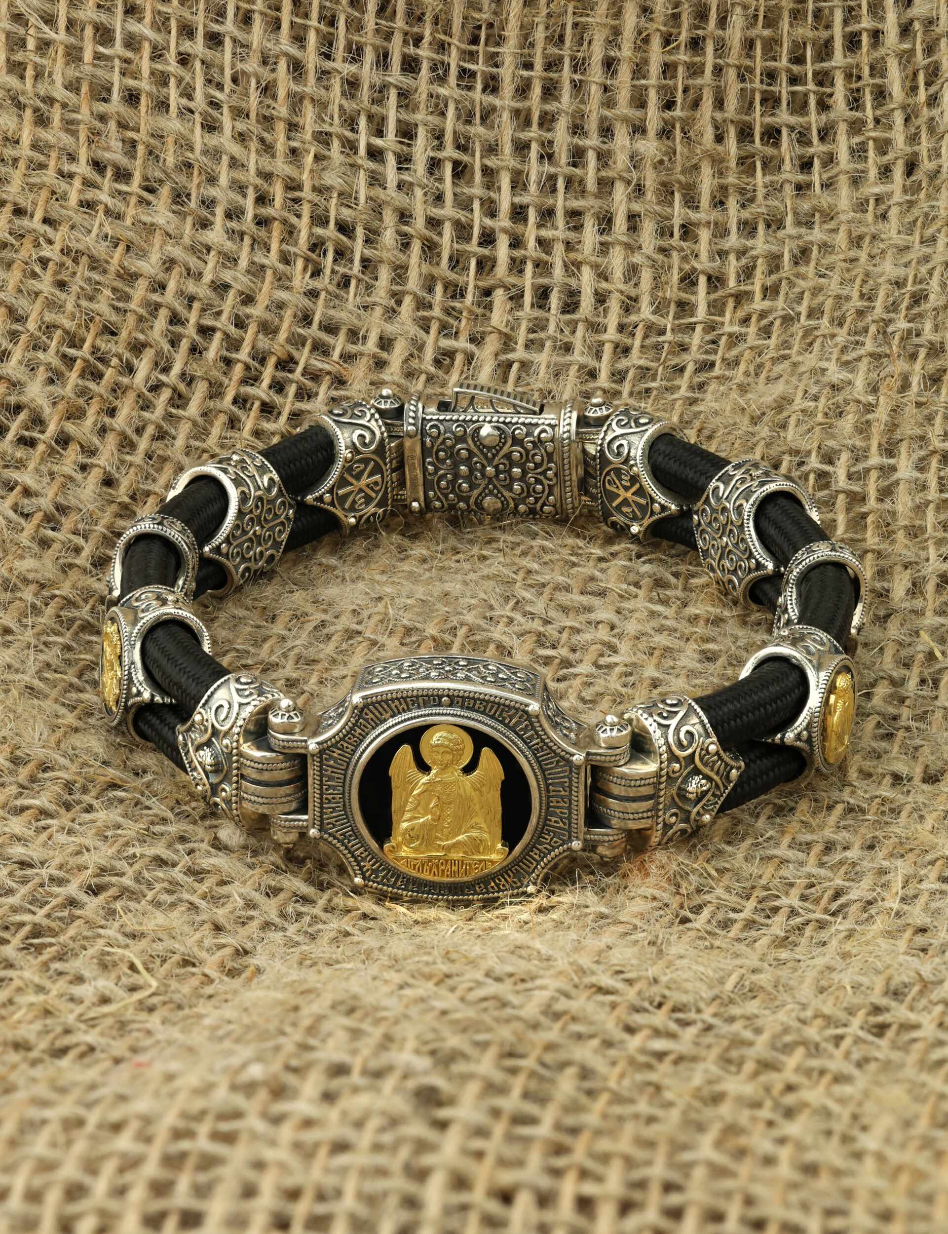 Браслет из серебра и золота c ониксом и шёлковым шнурком