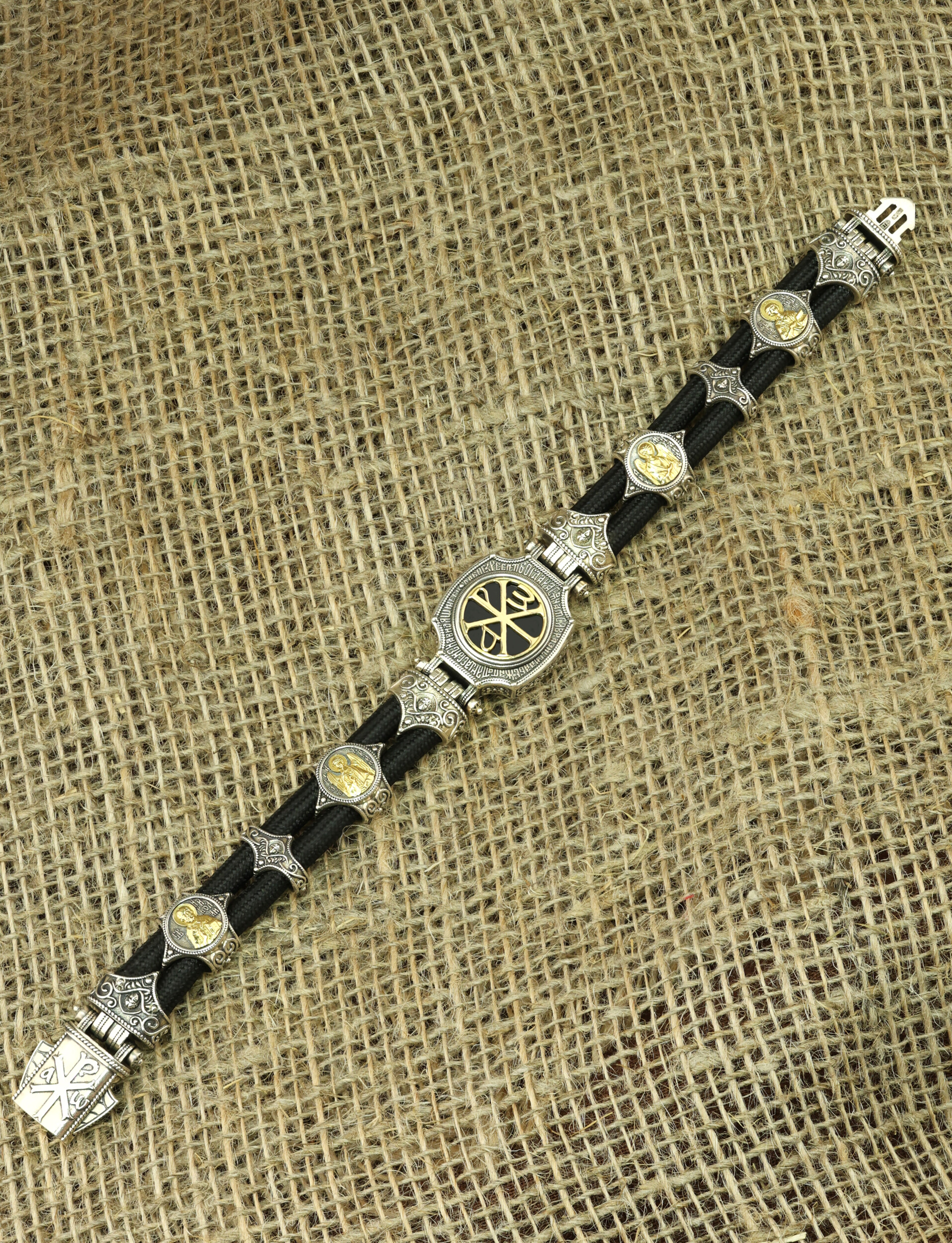 Браслет из серебра и золота c ониксом и шёлковым шнурком