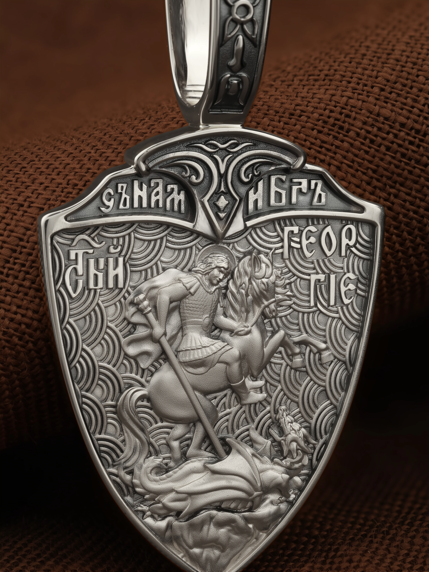 На оборотной стороне образка изображен Святой Великомученик Георгий Победоносец — один из самых почитаемых и удивительных святых. На Руси он известен как Юрий или Егорий, заступник для верующих, чья жизнь имеет какое-либо отношение к военным делам, помощник в крестьянском труде. На образке Георгий изображен как воитель, сидящий на вздыбленном коне и поражающий копьем огнедышащего змея. Змей символизирует собою сатанинские силы. Молитвами вознесенными к Всевышнему и своей непреклонной верой он смог одолеть чудовище. Святой убил змея, спас царскую дочь, принесенную в жертву, и жителей города, их души от влияния дьявола, породив в них надежду и веру в Господа, призывая людей принять христианскую веру.