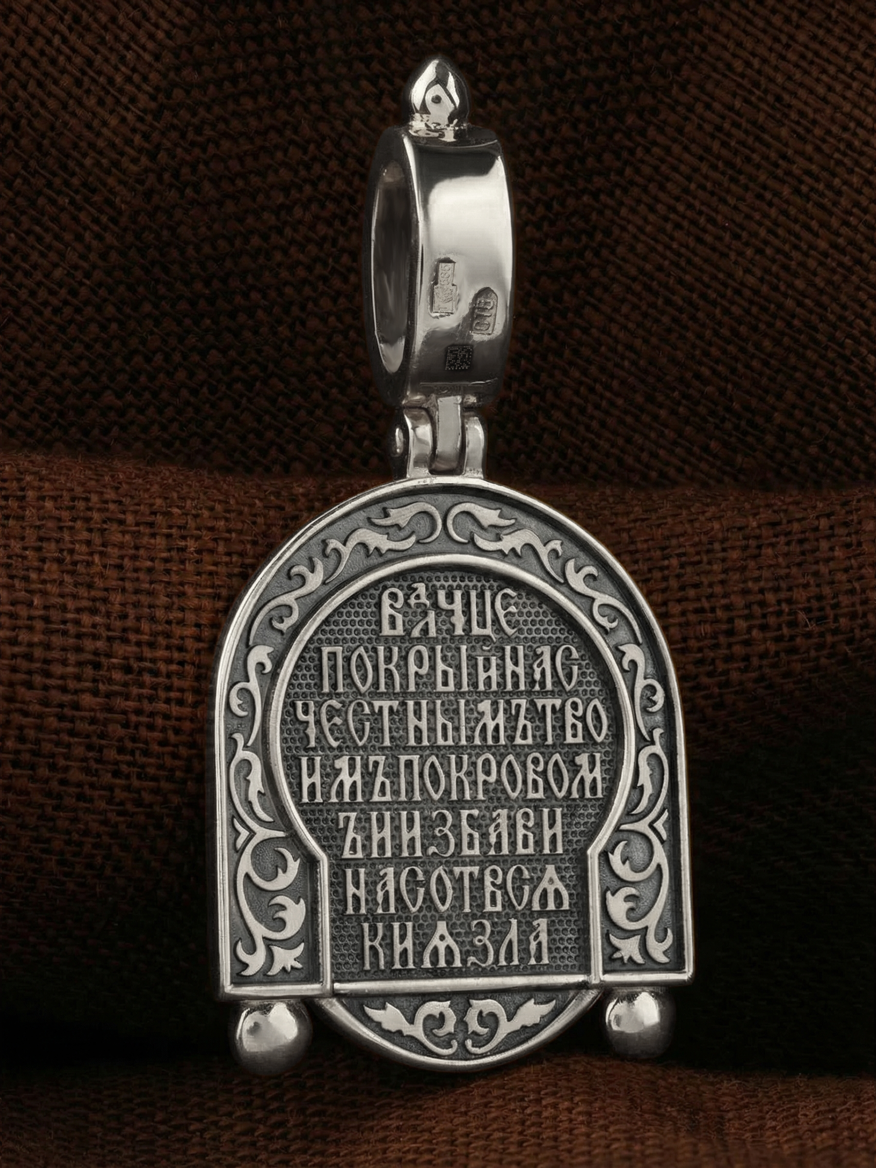 На лицевой части образка изображена икона Покров Пресвятой Богородицы. Праздник Покрова Божией Матери является воспоминанием чуда, которое произошло во Влахнернской церкви 1 (14) октября 910 года: Пресвятая Богородица явилась верующим над алтарем храма и распростерла над ними Свое покрывало. В этот день Божья Матерь открыла людям, что Она является Ходатаицей за них перед Богом. Богородица простирает Свой молитвенный покров над всеми православными христианами и умоляет Сына Своего о даровании вечного спасения каждому человеку.