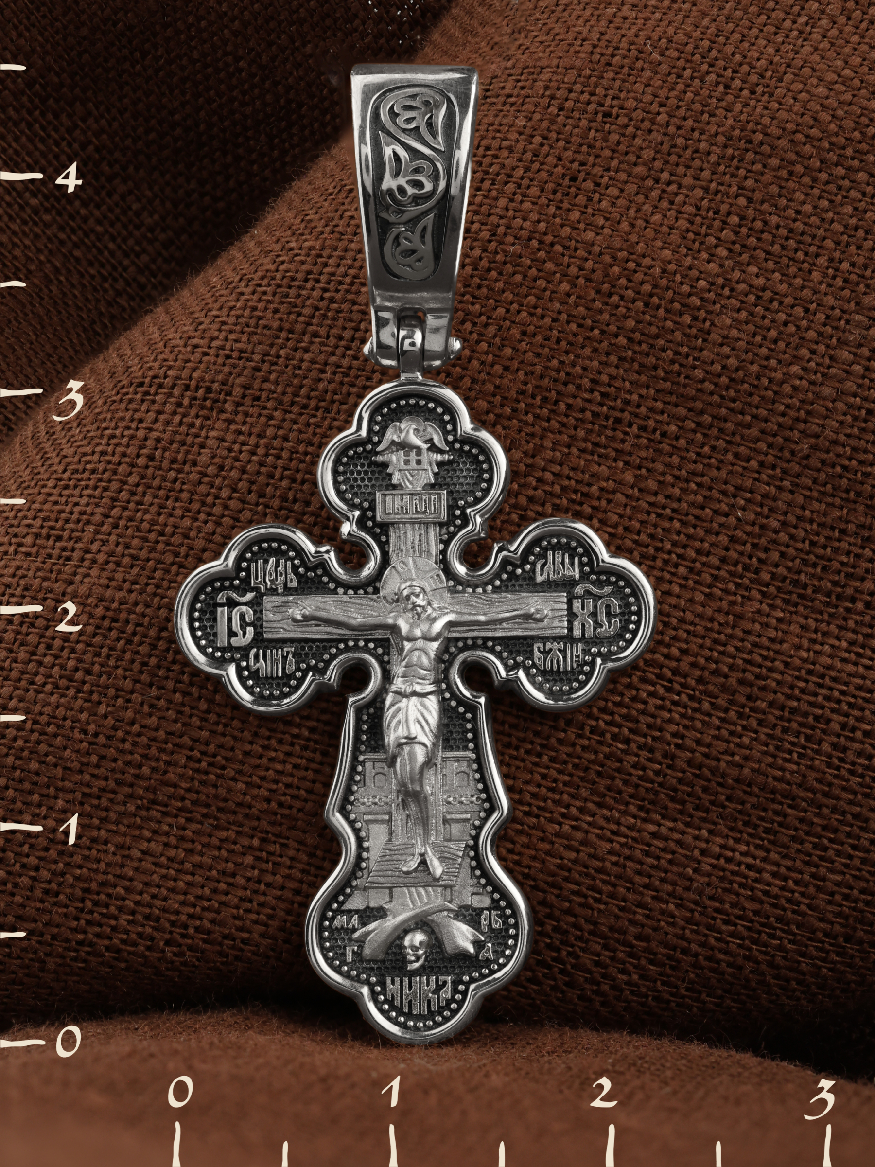 На лицевой стороне креста изображено Распятие Господа и Спасителя нашего Иисуса Христа. Христос, подвергнутый на кресте мучительной казни, своими страданиями искупил нас от древнего греха и даровал нам жизнь вечную. На верхней табличке, выше головы Иисуса, расположена надпись, составленная Понтием Пилатом — «IНЦI». Она означает «Иисус Назорей, Царь Иудейский». Распятие сопровождается каноническими надписями. Надпись «IС ХС» означает Иисус Христос, надпись «Царь Славы» и словосочетание «СЫН БОЖИЙ», что означает божественную природу Иисуса Христа, помещаются на разных сторонах поперечной перекладины креста. В нижней части креста находятся надписи –«НИКА» и «МЛРБ». В переводе с греческого, слово «НИКА» означает «победитель». Именно оно является символом победы Христа над смертью. Надпись «МЛРБ» — «место лобное рай бысть» означает, что место лобное стало раем. Крест стоит на горе камней, символизирующих Голгофу. Под подножием Креста изображена покоящаяся голова (череп) Адама и надпись «Г.А.». Христос в Своей Божественной любви, над которой смерть не властна и которая, страдая, и не страдает в обычном смысле, простирает к людям со Креста Свои объятия, в которые призывается и привлекается весь мир. Поэтому Тело Его не висит, а торжественно покоится на Кресте.