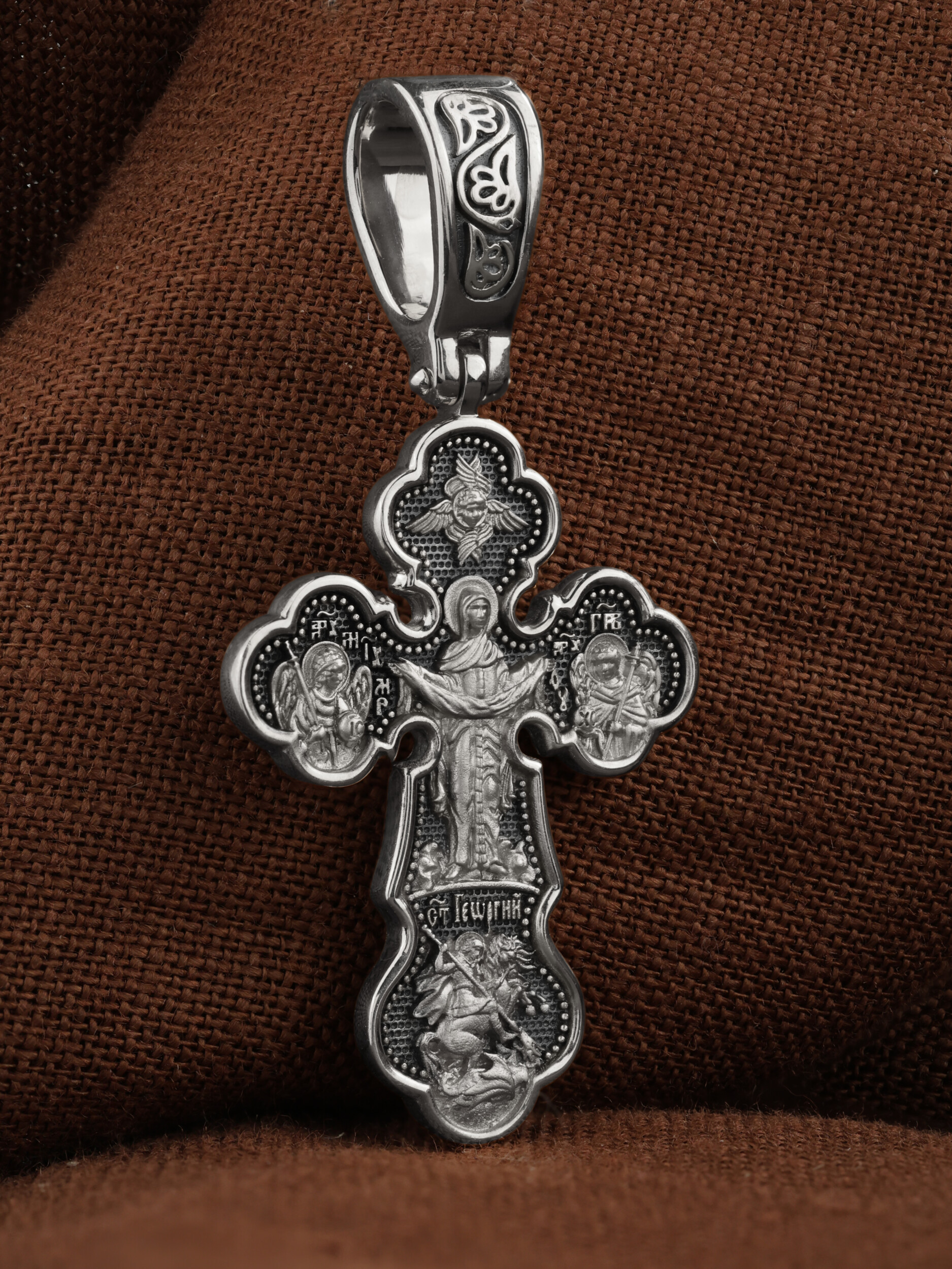 Центральную часть оборотной стороны креста украшает икона Божией Матери «Покров Пресвятой Богородицы». Праздник Покрова Пресвятой Богородицы пришел на Русь в XII веке из Византии и стал одним из самых почитаемых. Пресвятая Богородица простирает Свой молитвенный покров над всеми православными христианами и умоляет Сына своего о даровании вечного спасения каждому человеку. Над образом помещен шестикрылый Серафим. Справа помещено изображение Архангела Гавриила, слева- Архангела Михаила. На кресте внизу помещено изображение Святого Великомученика Георгия Победоносца — одного из самых почитаемых и удивительных святых. Он изображен как воитель, сидящий на вздыбленном коне и поражающий копьем огнедышащего змея. Змей символизирует собою сатанинские силы.