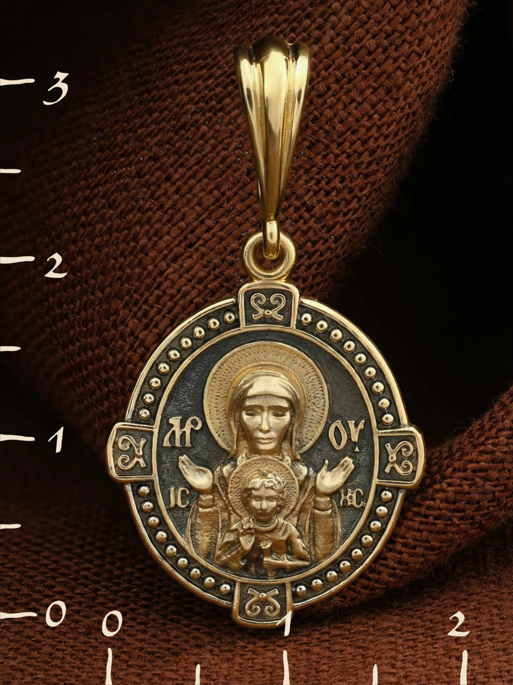 В центр образка помещен образ Божией Матери «Знамение», прославившийся многими чудесами в Новгороде в XII веке. Икона эта чтится как одна из самых великих святынь Русской земли. Молитвенно воздетые руки Богородицы означают заступничество за людей пред Богом. Рядом с Ней, на фоне круглого щита, — благословляющий Божественный Младенец — Спас-Эммануил.