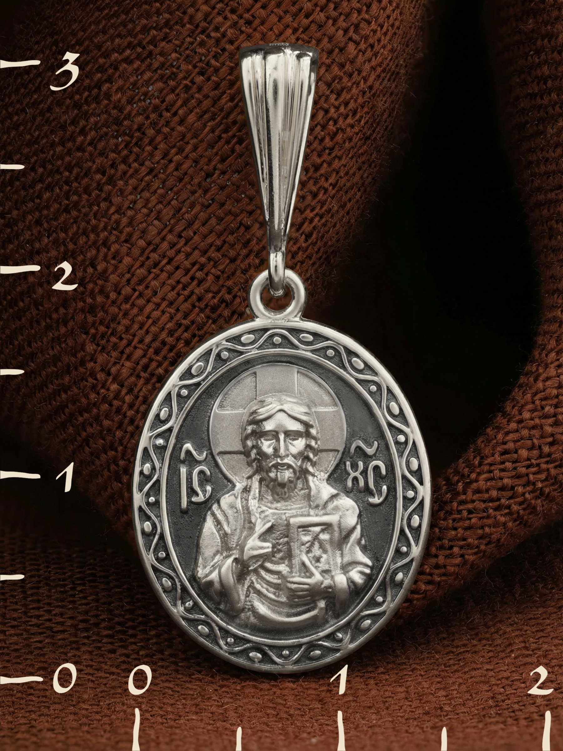 На лицевой части образка изображен Спас Вседержитель или Пантократор (от греч. «панкратос"— всевластный, всесильный) — центральный образ в иконографии Христа, представляющий Его как Небесного Царя и Судию. Господь правой рукой благословляет, а в левой держит Книгу Жизни, в которой для каждого человека есть своя страница.