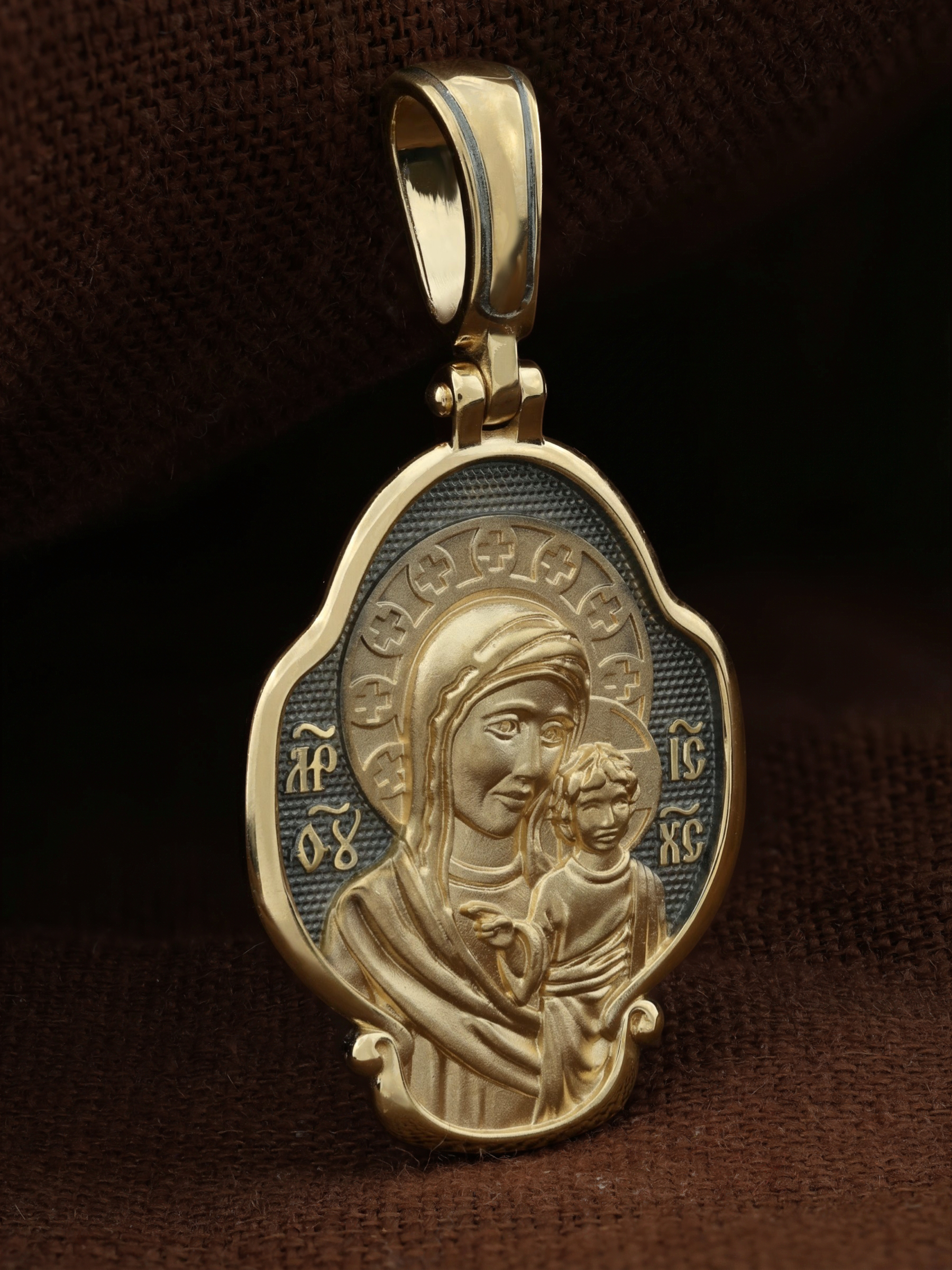 На лицевой части образка изображена Казанская икона Божией Матери — одна из самых почитаемых в России чудотворных икон Богородицы. Богословское значение Казанской иконы — указать верующим истинный Путь к спасению, который лежит через Христа. Только Божия Матерь имеет настолько сильное дерзновение к Спасителю, что может ходатайствовать перед Ним за всех верных. Именно этот образ дарится новой повенчанной паре, как хранитель очага и семейная реликвия. Молитва перед Казанской иконой Божьей Матери помогает во всех сложных случаях жизни, в болезнях, во всех печалях, невзгодах, скорбях. Уникальная история появления, чудеса, случившиеся по молитвам православных людей возле образа — все это делает Казанскую Богородицу особенной, среди тысяч других икон.
